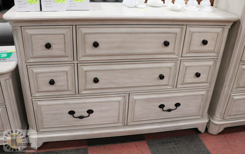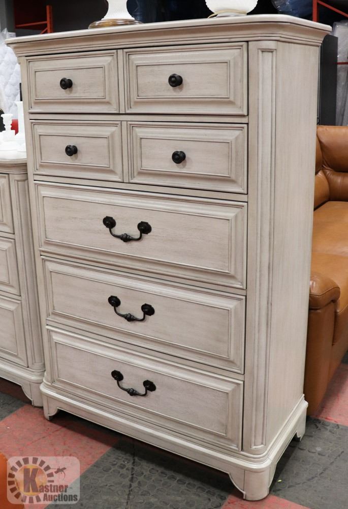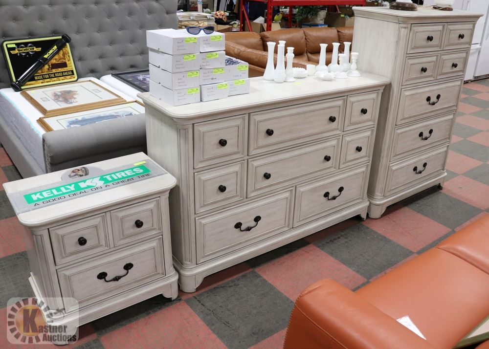 5 DRAWER TALL BOY DRESSER (40"X18.5"X58"), 8 DRAWER DRESSER (62"X18.5"X42") AND 2 DRAWER NIGHT STAND (29"X18.5"X28")