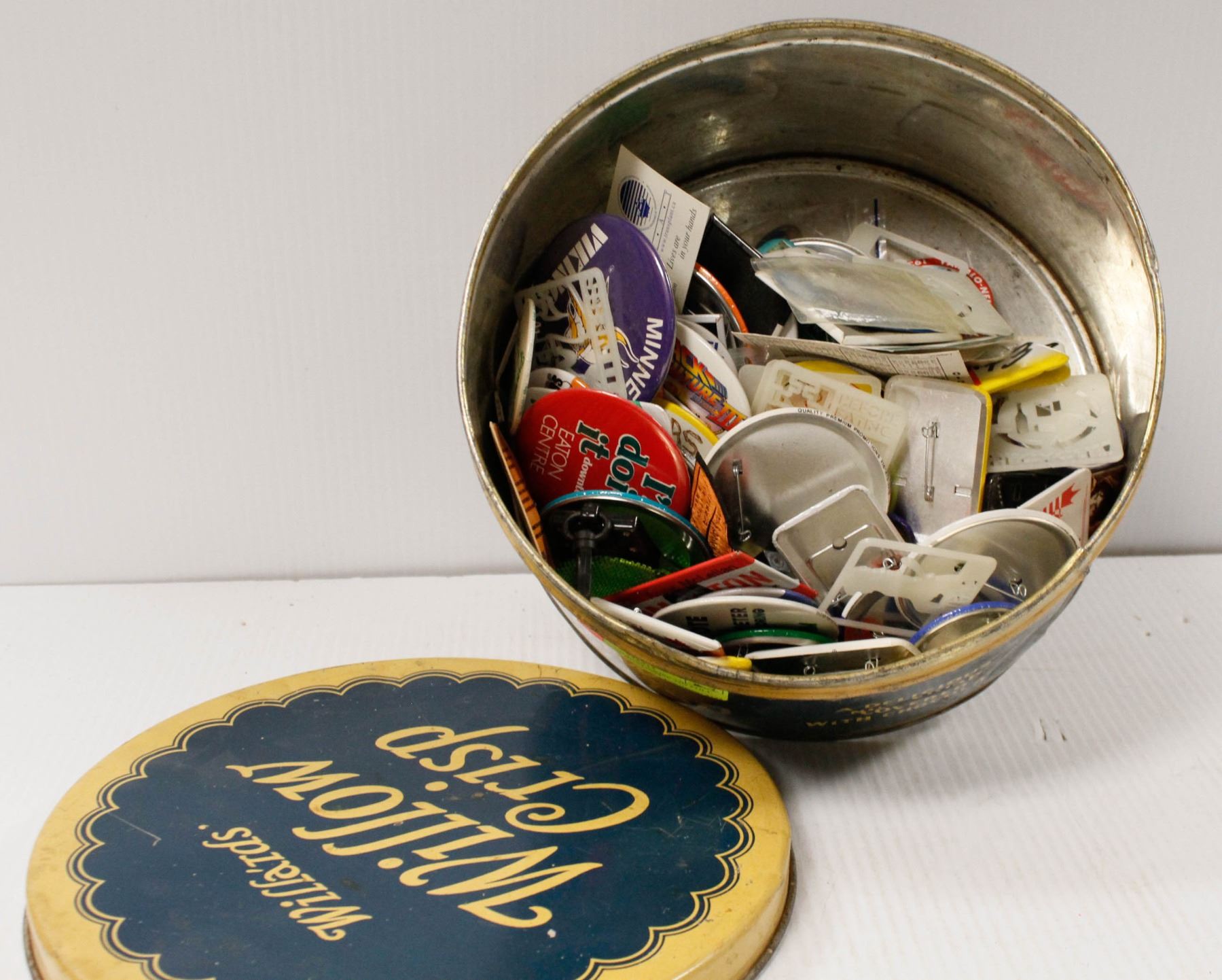 ANTIQUE WILLOW CRISP TIN FULL OF PINBACK BUTTONS