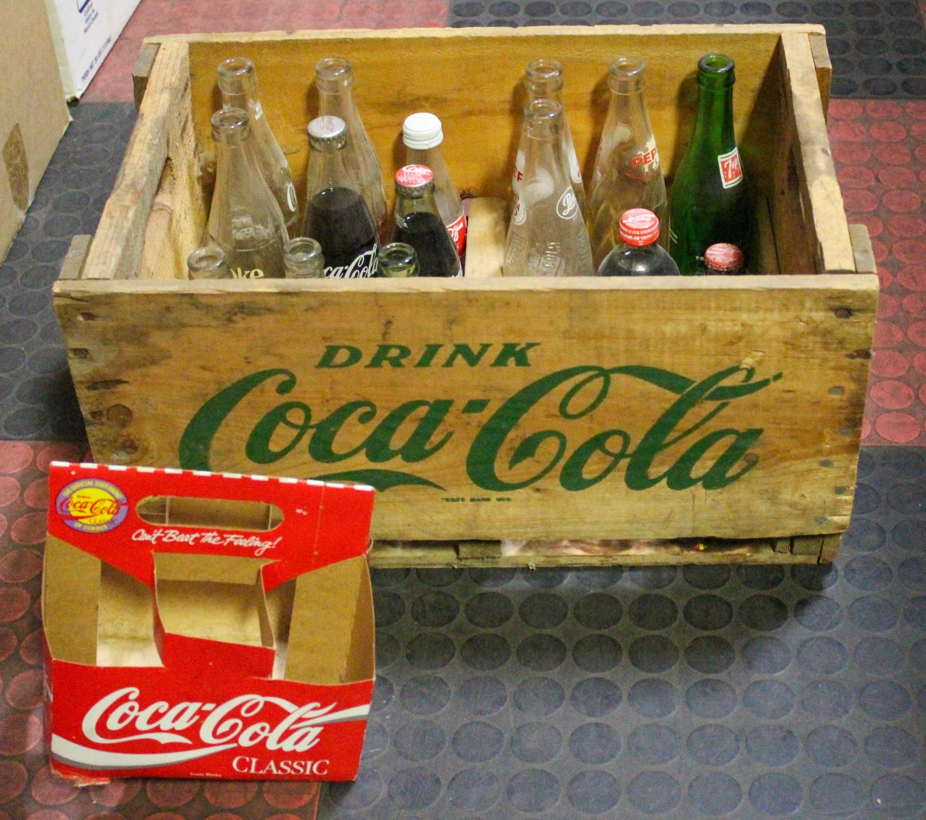 ANTIQUE WOOD COKE CRATE FULL OF BOTTLES