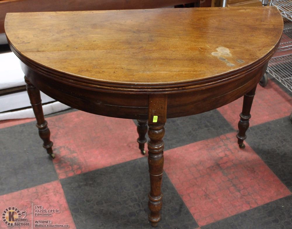 ANTIQUE WOOD HALF MOON SIDE TABLE ON MINI CASTORS