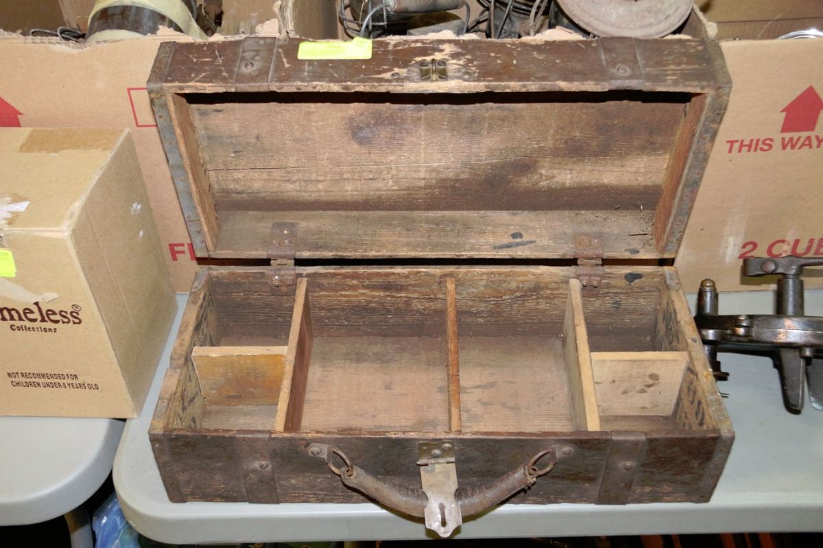 ANTIQUE WOOD, METAL AND LEATHER TOOLBOX