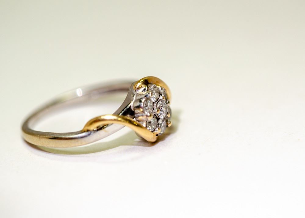 SIZE 7.5. THE BRIGHT POLISHED TWO TONE CLUSTER STYLE MOUNT SECURES SEVEN ROUND BRILLIANT CUT DIAMOND MEASURING 2.60 - 2.80 MM., CLARITY GRADE I-1., COLOR GRADE G-H. TOTAL DIAMOND WEIGHT 0.50 CARAT. THE GIRDLE OF THE CENTER DIAMOND IS LASER INSCRIBED, CD1 A19425. TOTAL WEIGHT 3.40 GRAMS. COMES WITH CERTIFICATE OF APPRAISAL FROM LOCAL APPRAISER, SUGGESTED INSURANCE COVERAGE $2000.00. JEWELLERY