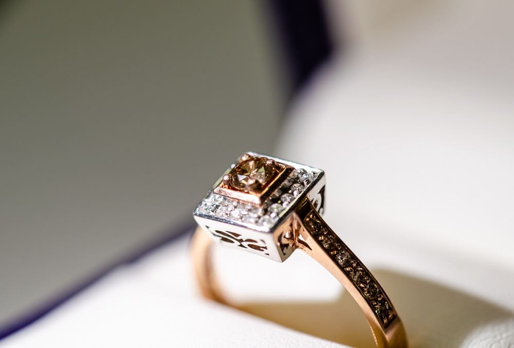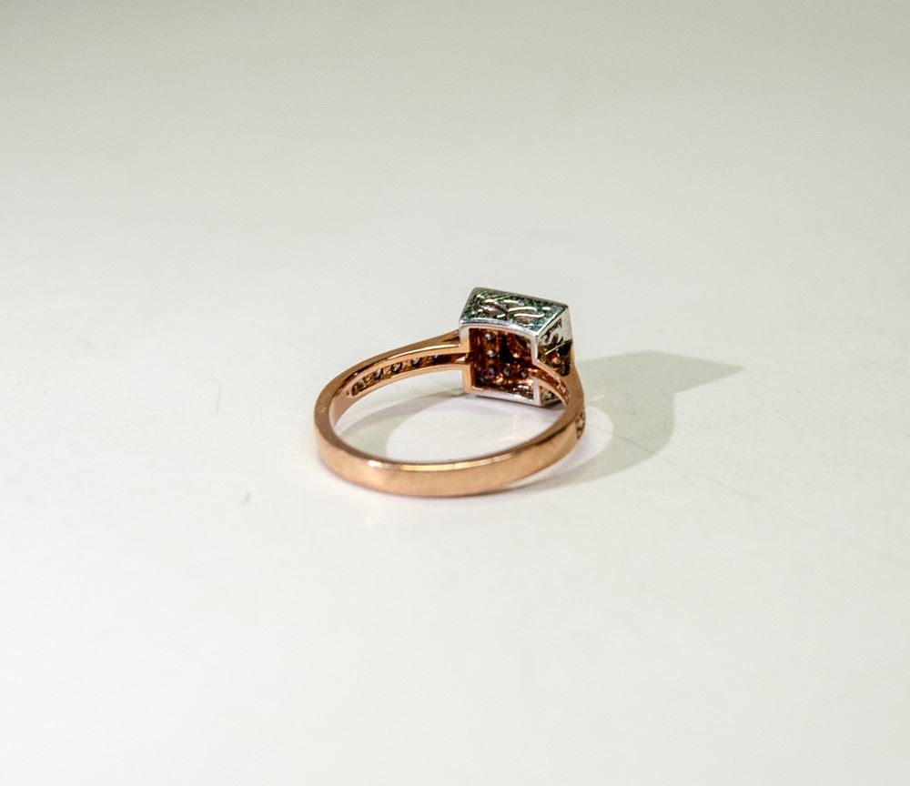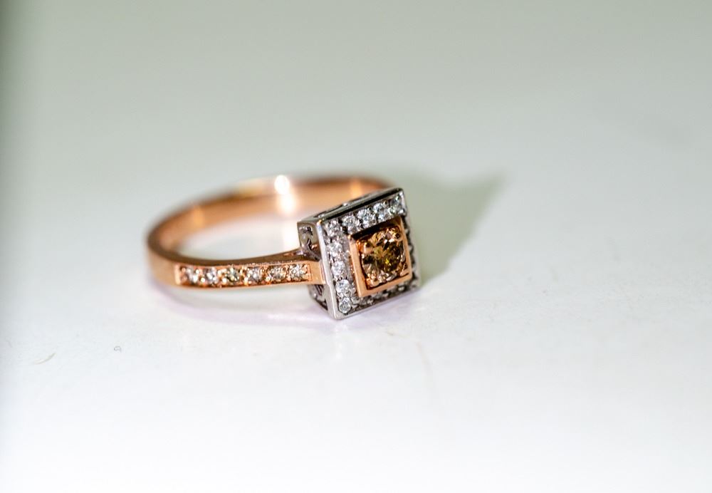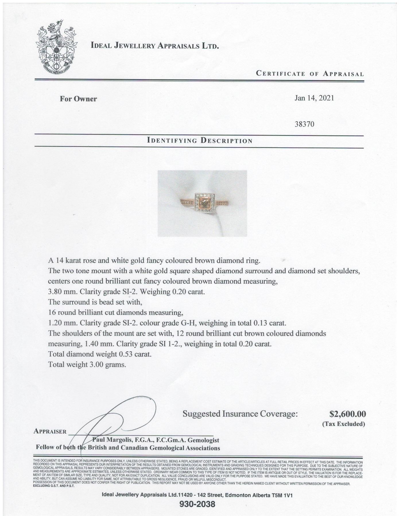 RING. SIZE 6.5. THE TWO TONE MOUNT WITH A WHITE GOLD SQUARE SHAPED DIAMOND SURROUND AND DIAMOND SET SHOULDERS CENTERS ONE ROUND BRILLIANT CUT FANCY COLORED BROWN DIAMOND MEASURING, 3.80 MM., CLARITY GRADE SI-2. WEIGHING 0.20 CARAT. THE SURROUND IS BEAD SET WITH 16 ROUND BRILLIANT CUT DIAMONDS MEASURING 1.20 MM. CLARITY GRADE SI-2., COLOR GRADE G-H, WEIGHING IN TOTAL 0.13 CARAT. THE SHOULDERS OF THE MOUNT ARE SET WITH, 12 ROUND BRILLIANT CUT BROWNCOLORED DIAMONDS MEASURING 1.40 MM., CLARITY GRADE SI 1-2., WEIGHING IN TOTAL 0.20 CARAT. TOTAL DIAMOND WEIGHT 0.53 CARAT. TOTAL WEIGHT 3.00 GRAMS. COMES WITH CERTIFICATE OF APPRAISAL FROM LOCAL APPRAISER, SUGGESTED INSURANCE COVERAGE $2600.00. JEWELLERY