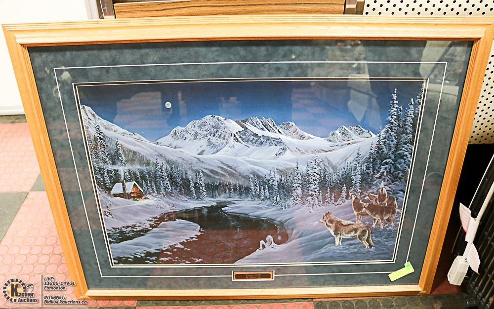 WELL KNOWN WILDLIFE ARTIST ,PLAQUE ON OAK FRAME WITH ARTIST NAME + TITTLE -WINTER GLOW- 29 IN X 39 IN