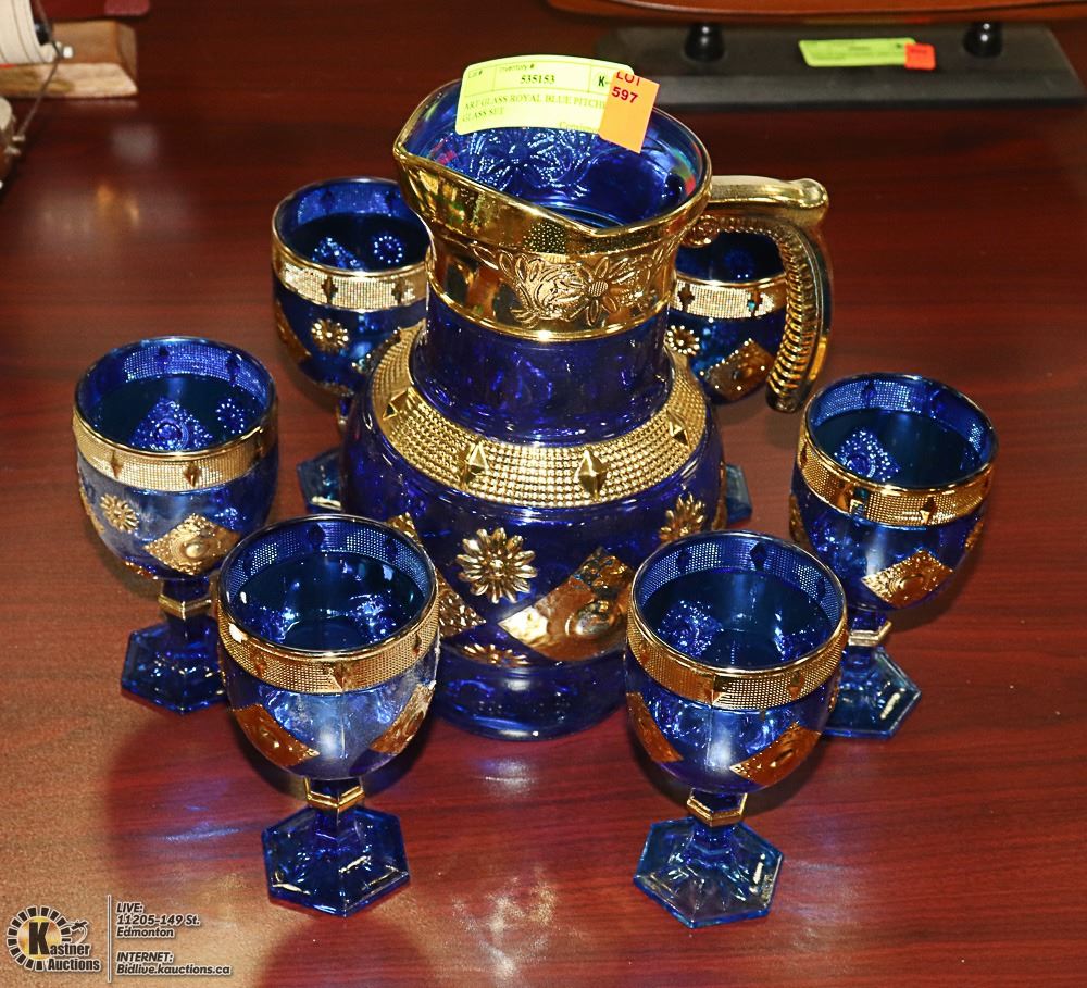 ART GLASS ROYAL BLUE PITCHER & GLASS SET
