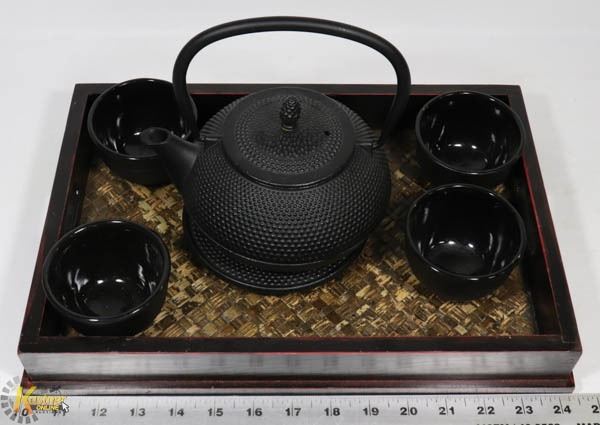 CUPS, CAST IRON, STAND AND CARRY TRAY. COLLECTIBLES