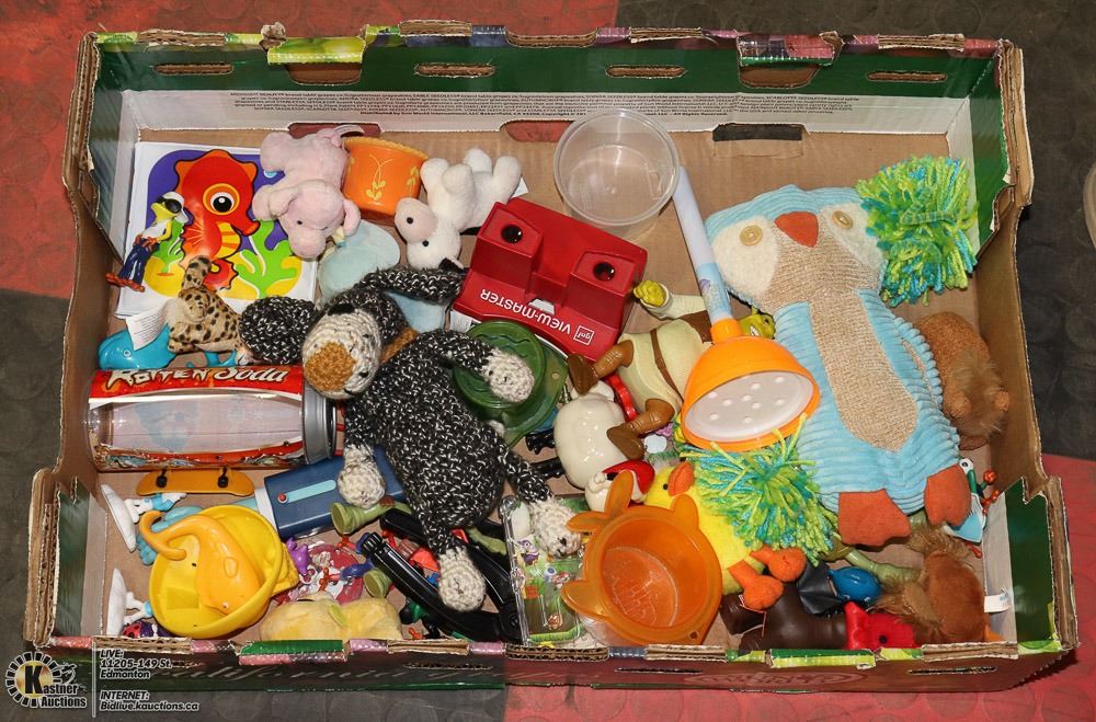 ASSORTED BOX OF KIDS TOYS, VIEW FINDER, OWL DOLL