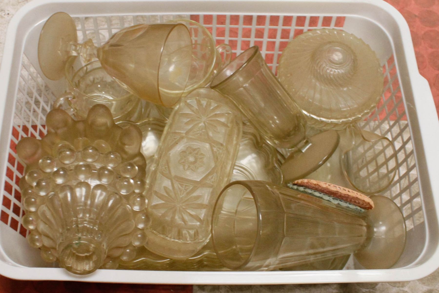 ASSORTED CARVED GLASS DISHES, CANDLE HOLDERS AND