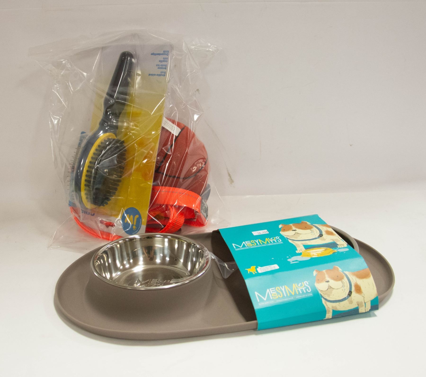 ASSORTED FLAT MESSY MUTTS FOOD TRAY, TOY LEASH