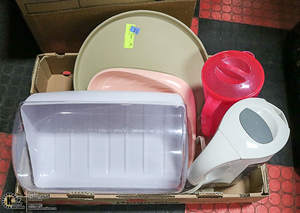 CLAY PIZZA PAN, KETTLE, JUICE JUG PLASTIC BREAD BOX
