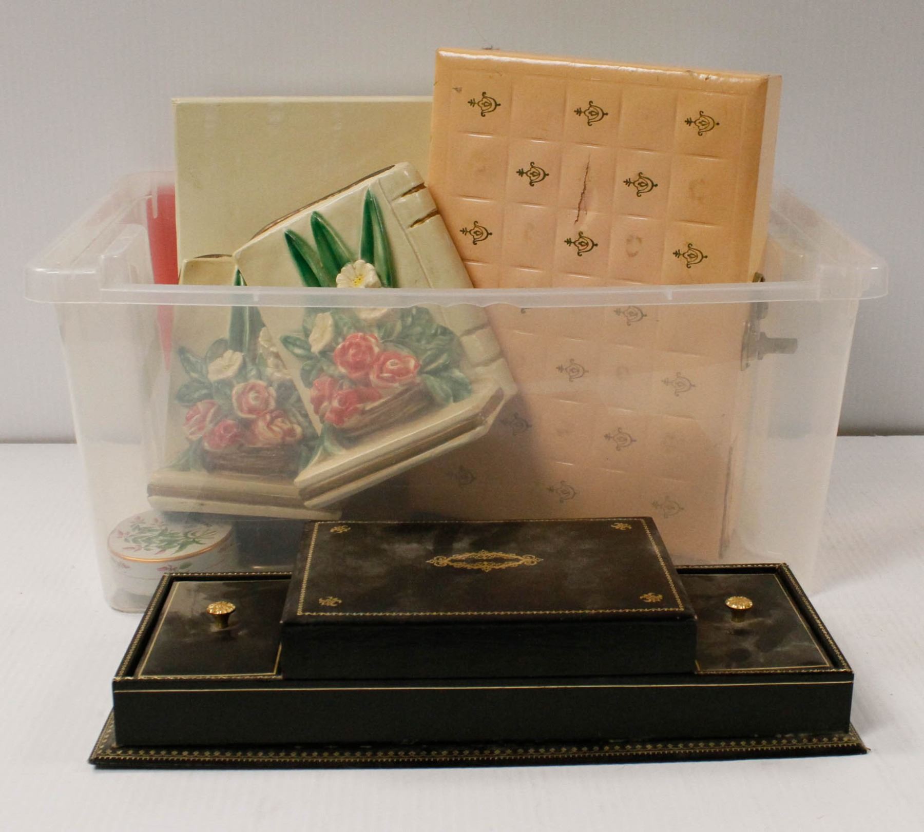 ASSORTED VINTAGE JEWELLERY BOXES W BOOKENDS