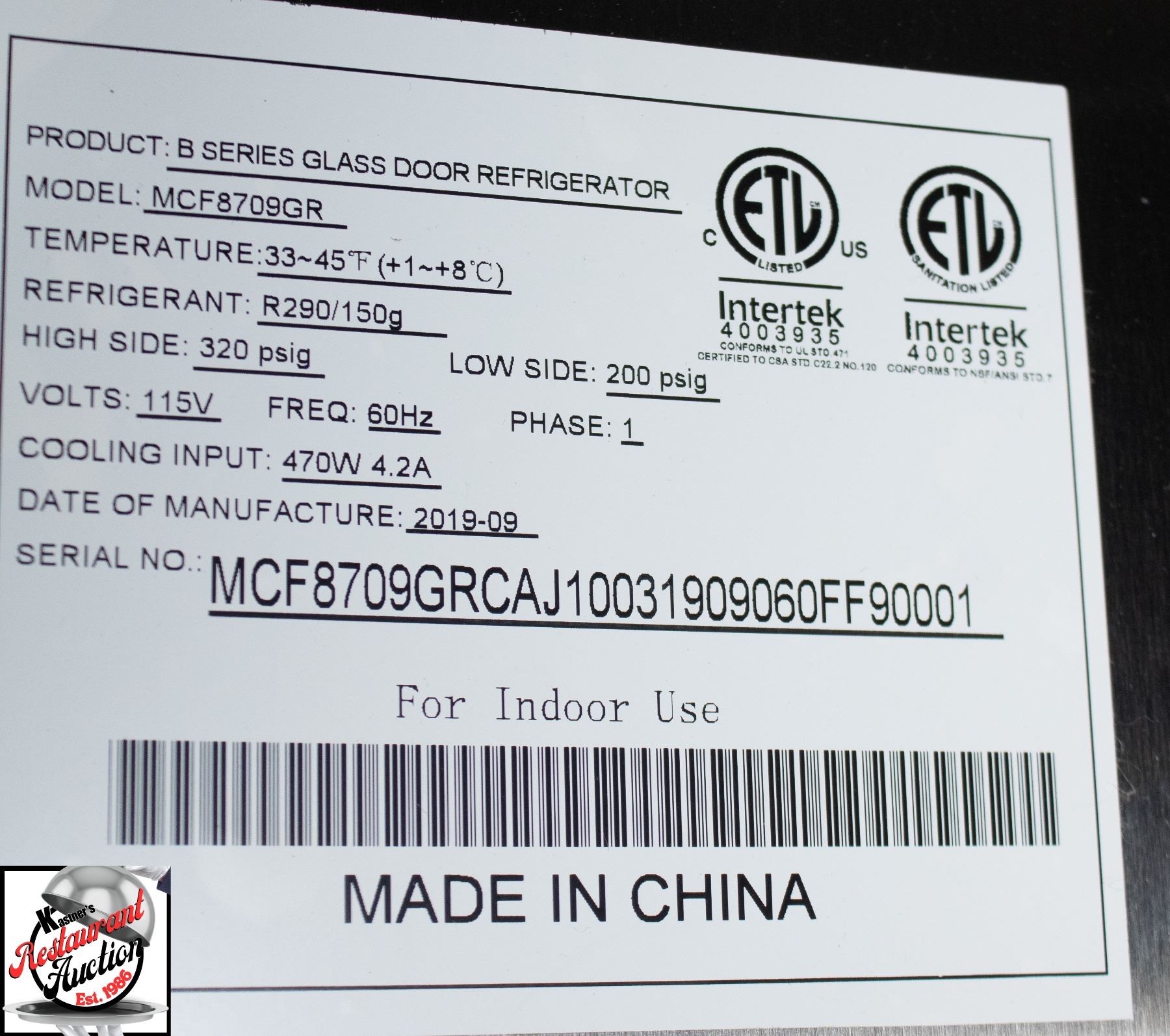( TESTED & WORKING ) MODEL # MCF8709GR, REFRIGERANT 290/150G, 115 VOLTS, PHASE 1, 470 WATTS, 4.2 AMPS, 60 HZ 29.5" X 55" X 81" * DAMAGE TO CASTORS * ***ALL EQUIPMENT WILL HAVE A 15 DAY WARRANTY, STARTING AT THE END OF THE AUCTION. SUBJECT TO TERMS AND CONDITIONS, MUST HAVE A PROOF OF A NON WORKING ITEM. ***