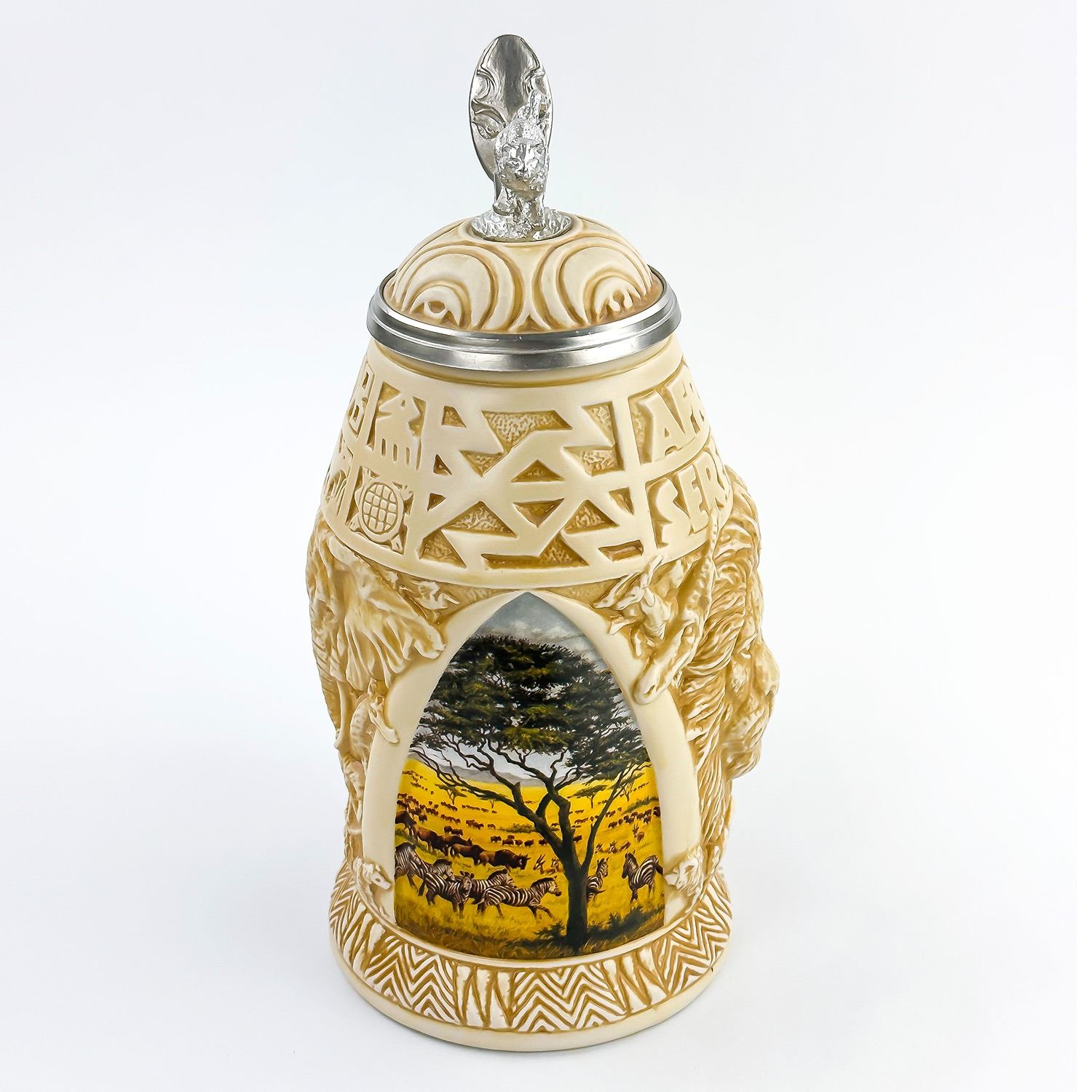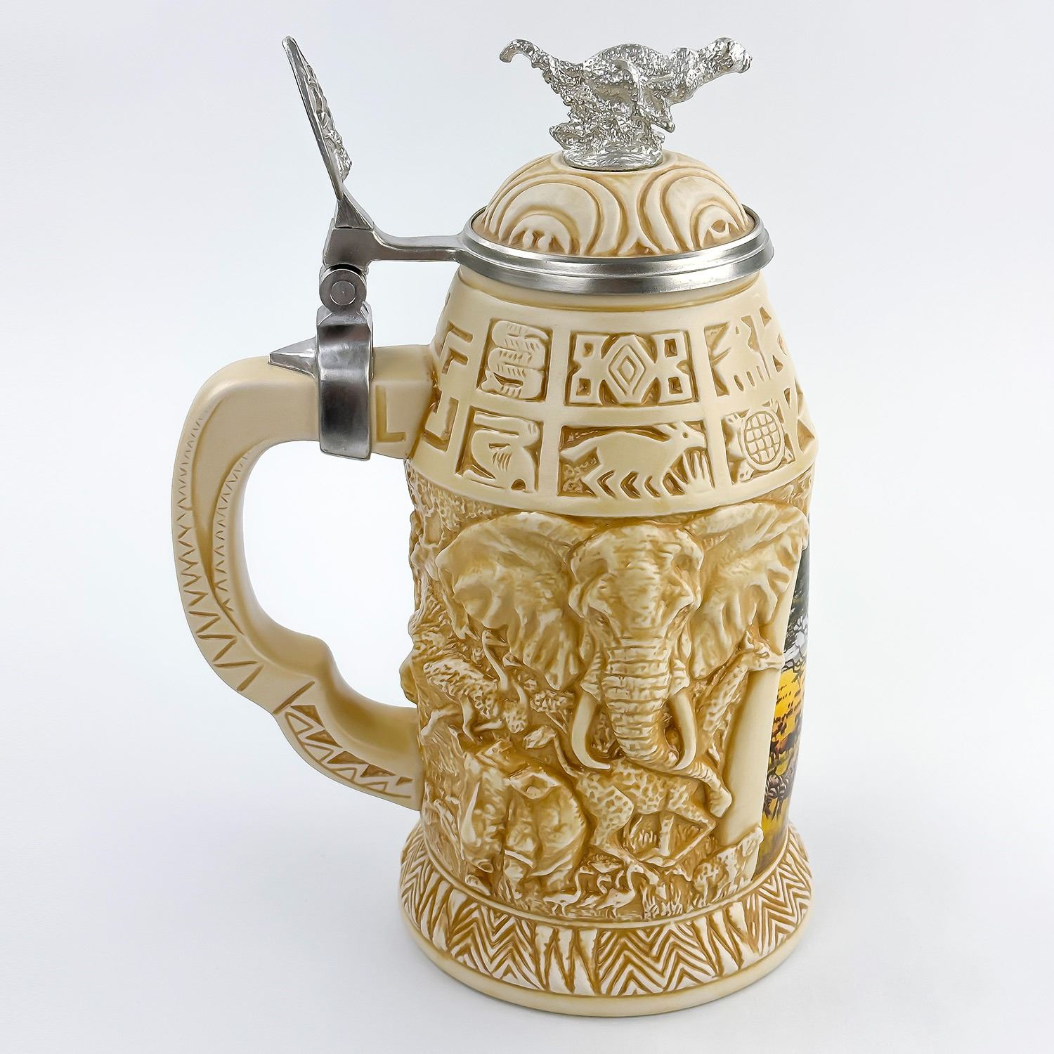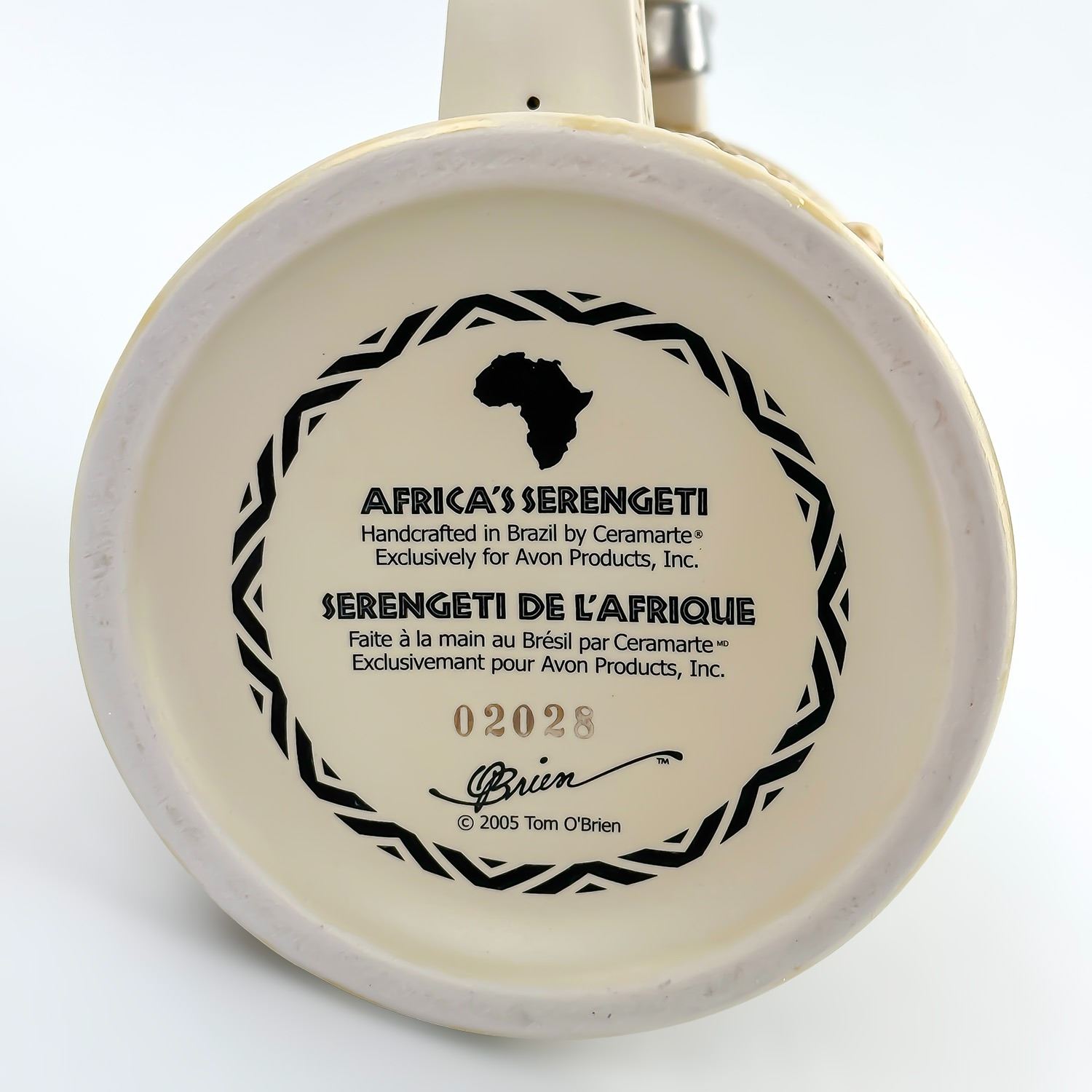 #8557 - LIMITED EDITION NUMBERED CERAMIC AVON BEER STEIN - HANDCRAFTED IN BRAZIL BY CERAMARTE - BAR DECOR. SAFARI ANIMALS - ELEPHANT, LION, ZEBRA, GIRAFFE, ZEBRA ETC. COPYRIGHT 2005 TOM O’BRIEN. MEASURES: 10” (25.5 CM) TALL BY 6.75” (17 CM) WIDE - INCLUDES HANDLE AND 4.75” (12 CM) DIAMETER BASE