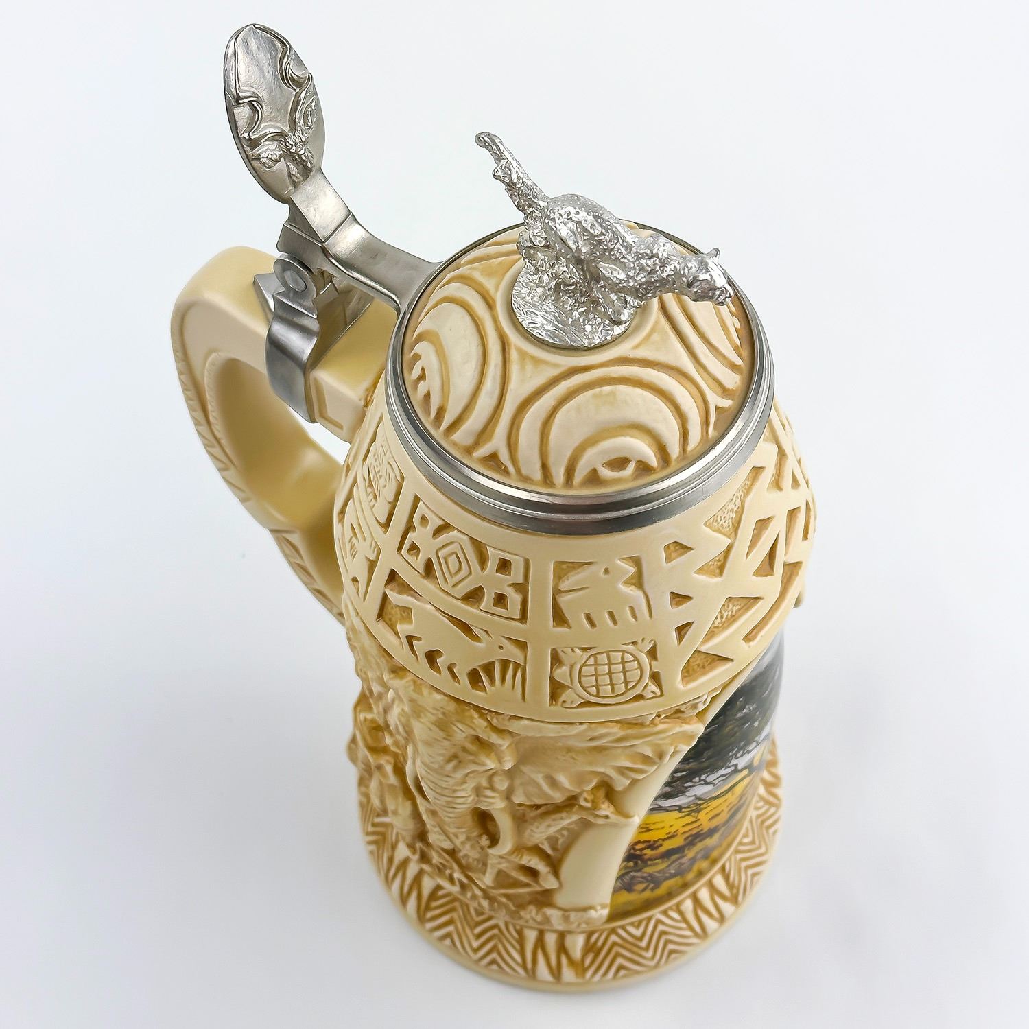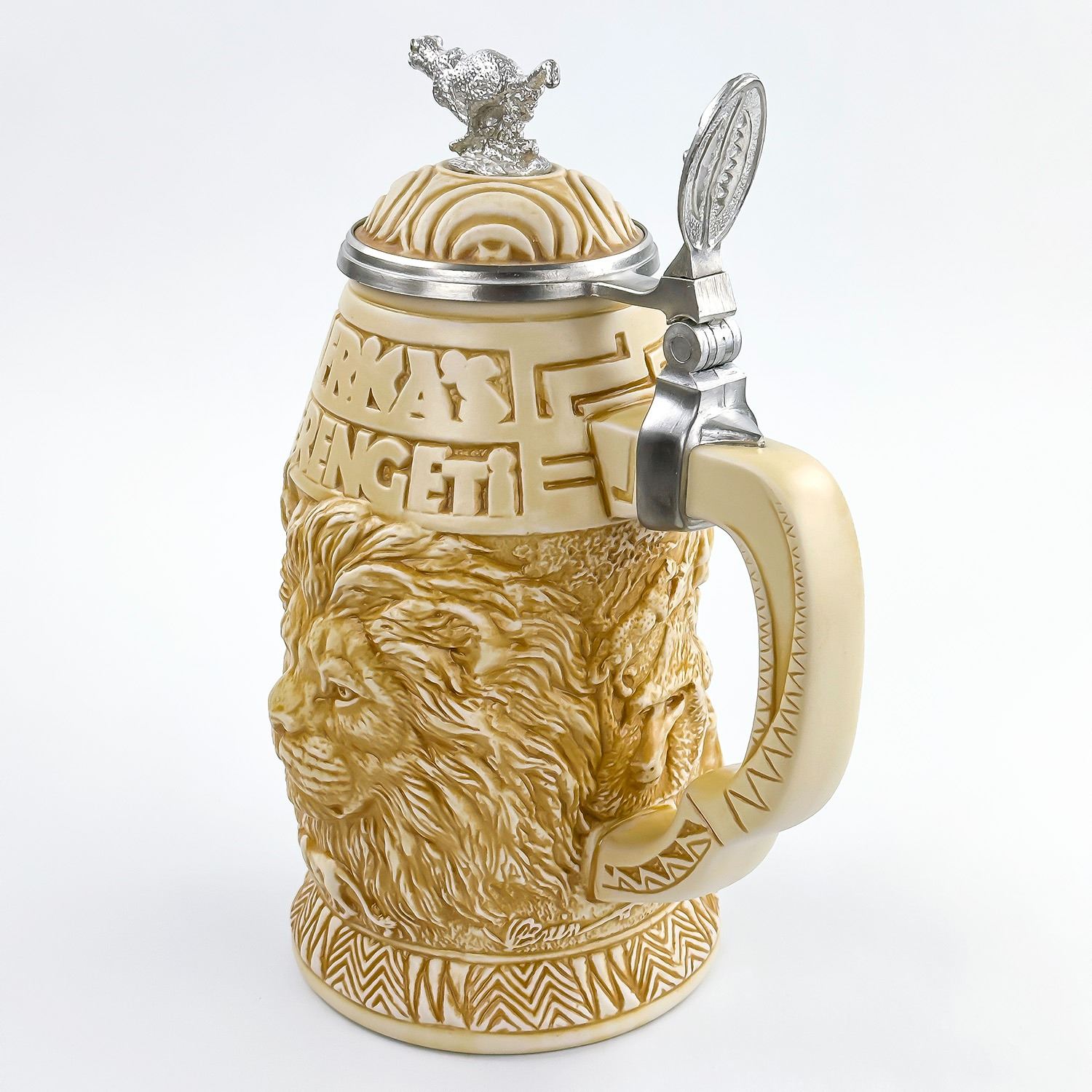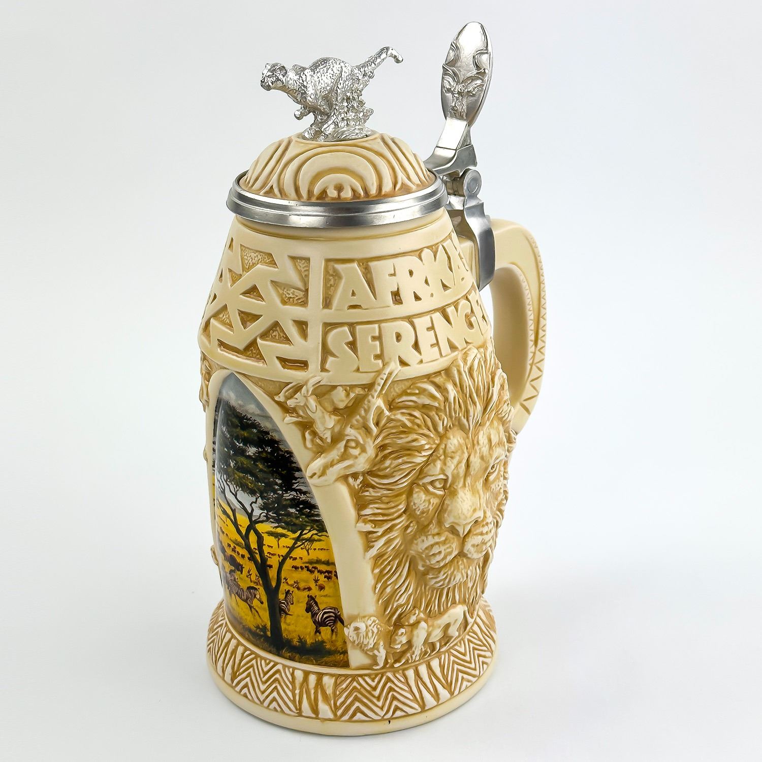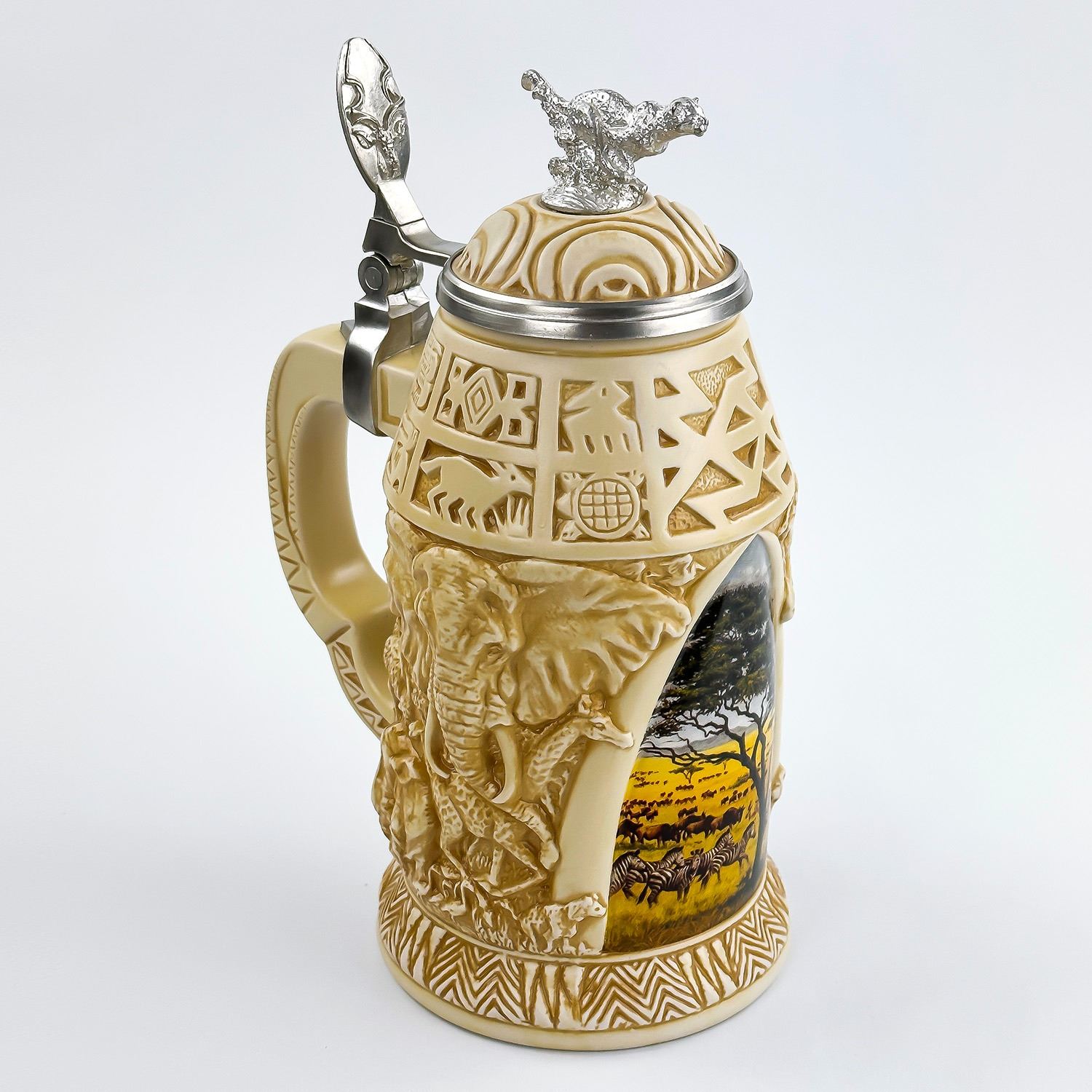 #8557 - LIMITED EDITION NUMBERED CERAMIC AVON BEER STEIN - HANDCRAFTED IN BRAZIL BY CERAMARTE - BAR DECOR. SAFARI ANIMALS - ELEPHANT, LION, ZEBRA, GIRAFFE, ZEBRA ETC. COPYRIGHT 2005 TOM O’BRIEN. MEASURES: 10” (25.5 CM) TALL BY 6.75” (17 CM) WIDE - INCLUDES HANDLE AND 4.75” (12 CM) DIAMETER BASE