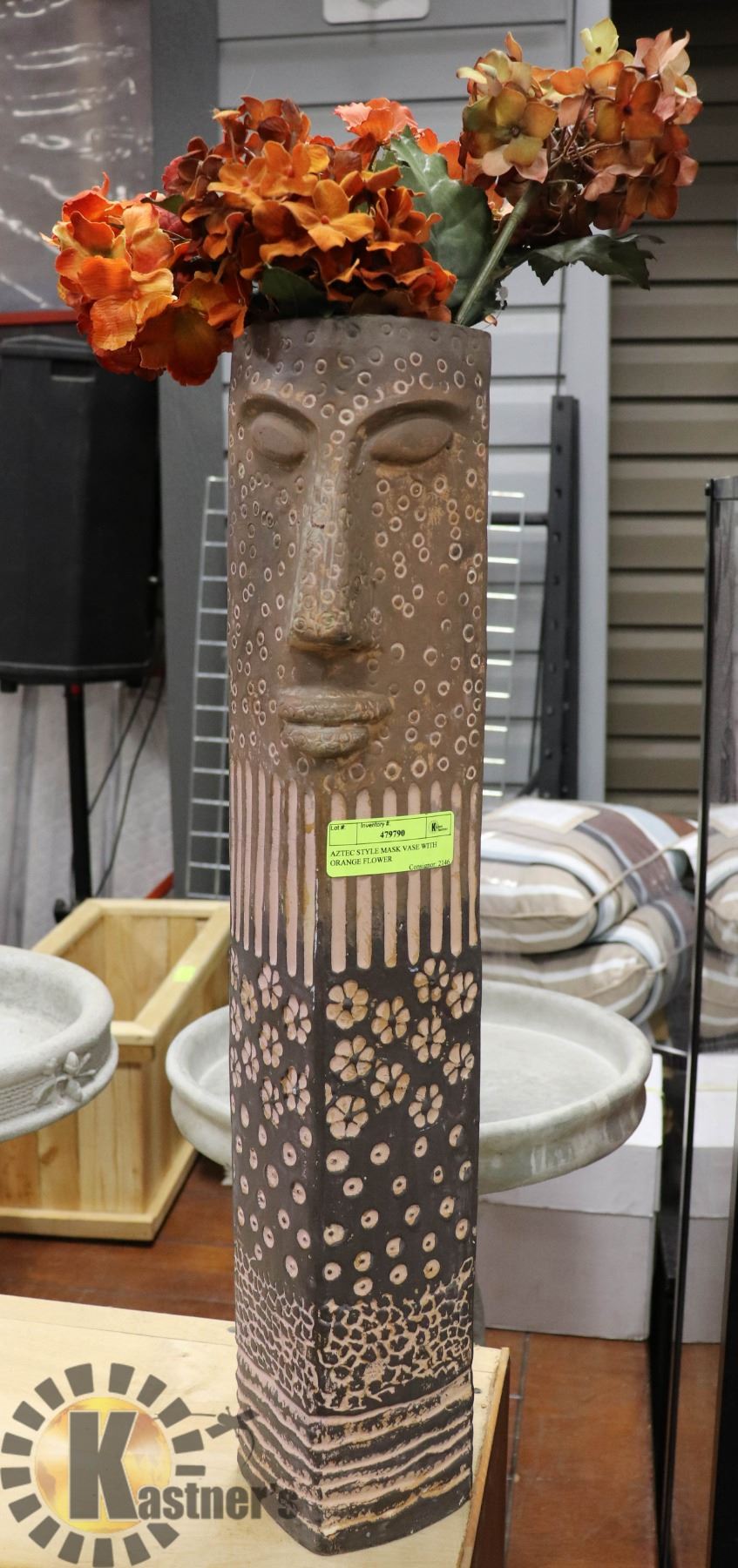 AZTEC STYLE MASK VASE WITH ORANGE FLOWER