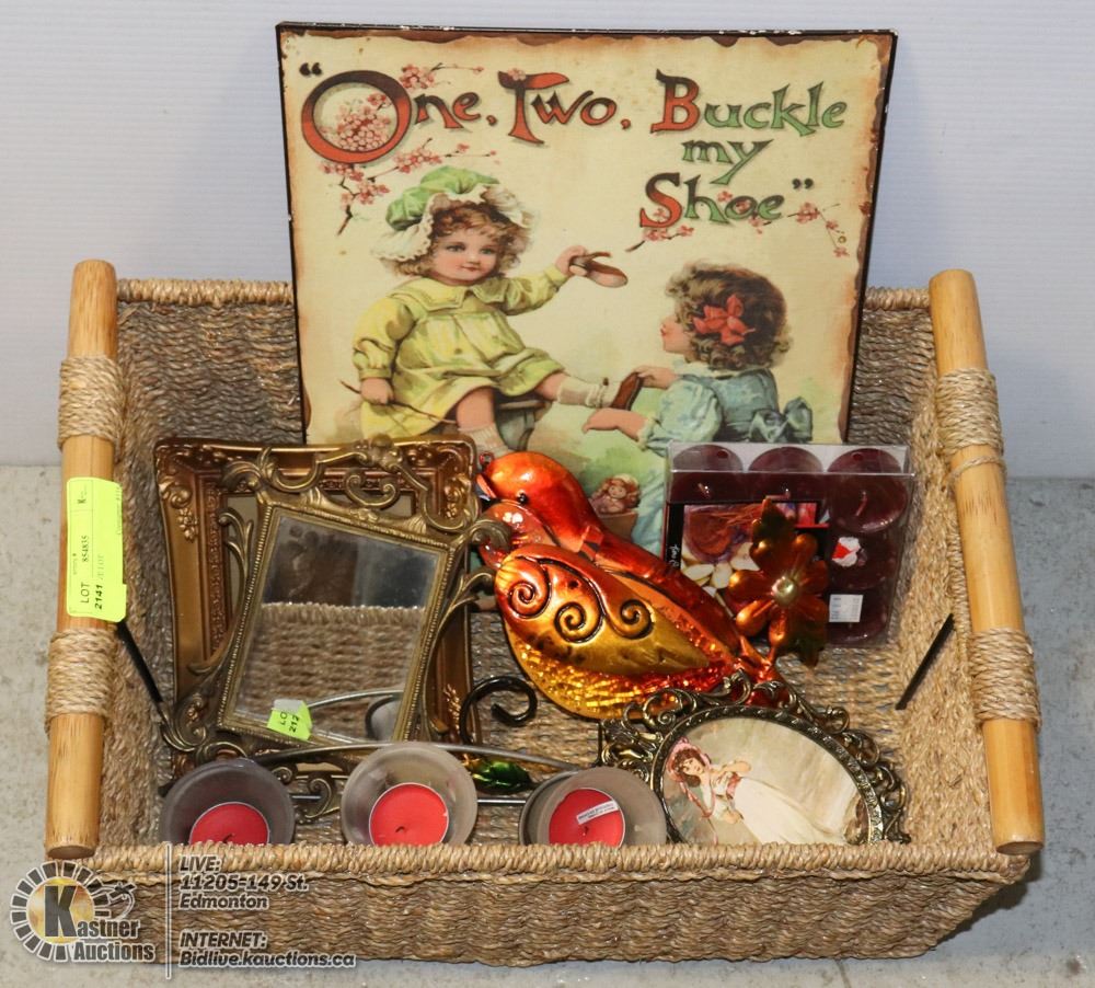 METAL BIRD WIND CHIME, GOLD FRAMES, PEWTER BUTTERFLY CANDLE STAND METAL SIGN AND CANDLES ALL TOGETHER