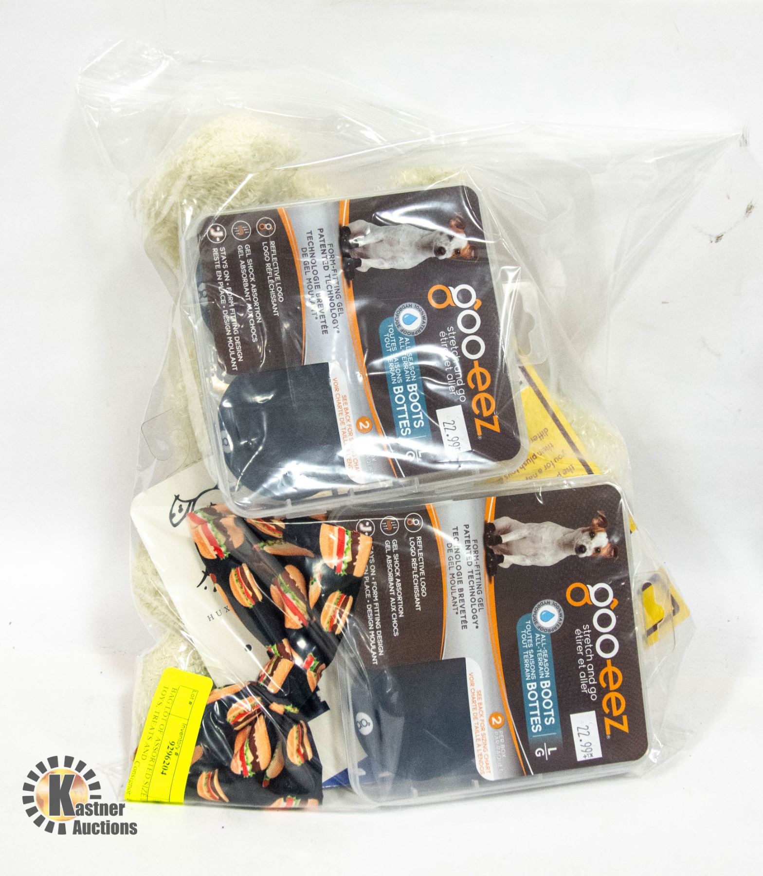 BAG LOT OF ASSORTED SIZE L DOG TOYS, TREATS AND