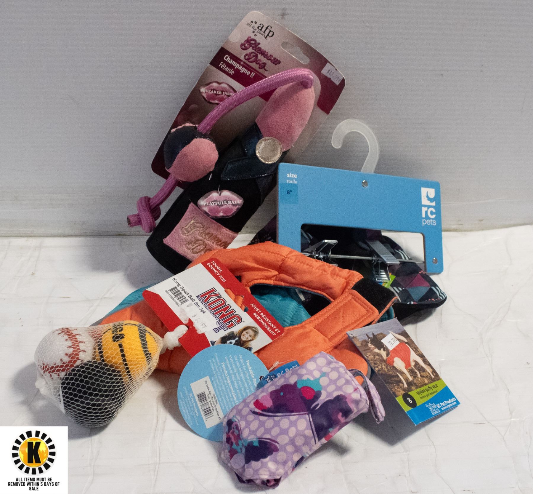 BAG LOT OF ASSORTED SIZE SM DOG TOYS, TREATS AND