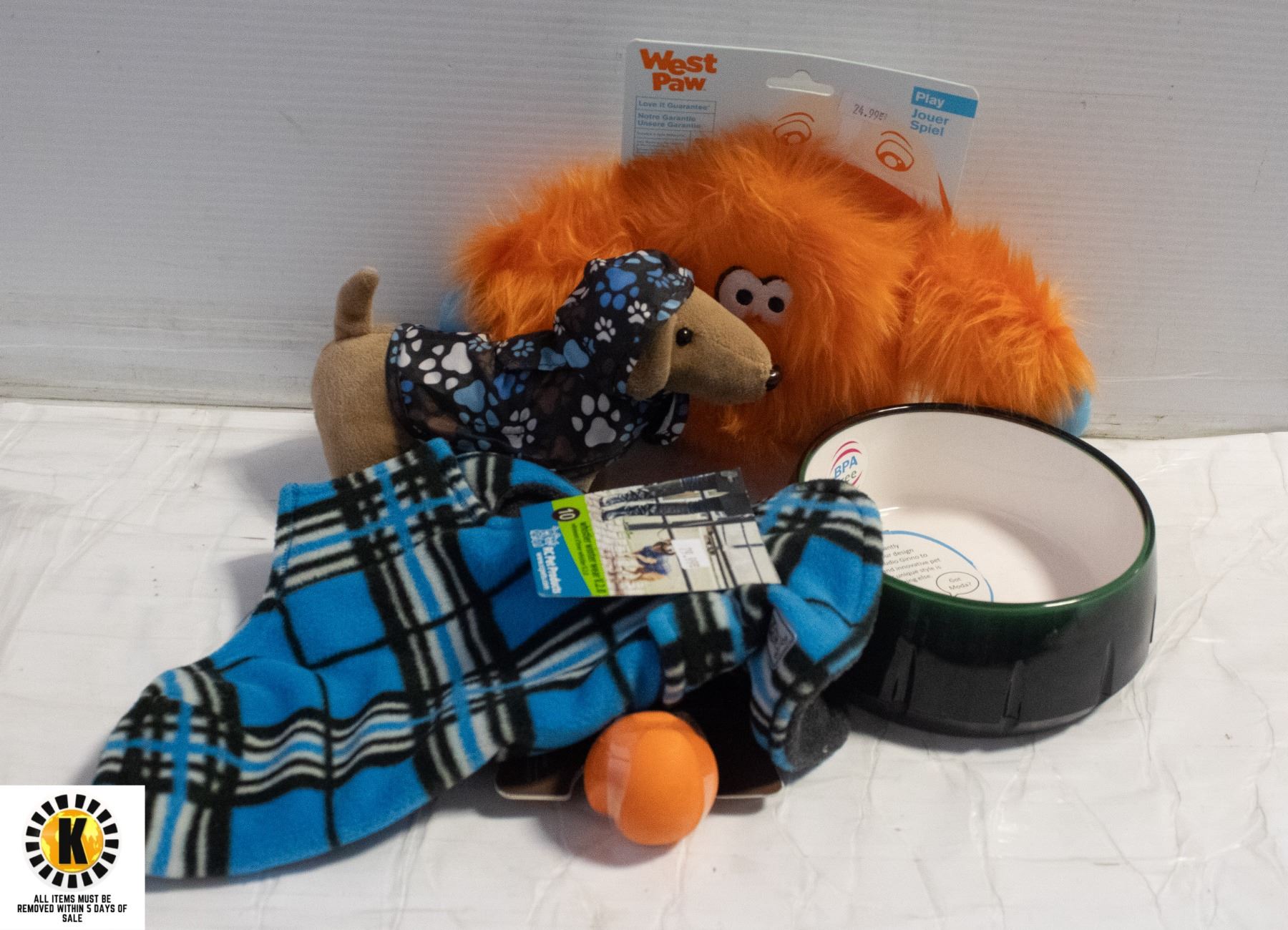 BAG LOT OF ASSORTED SIZE SM DOG TOYS, TREATS AND