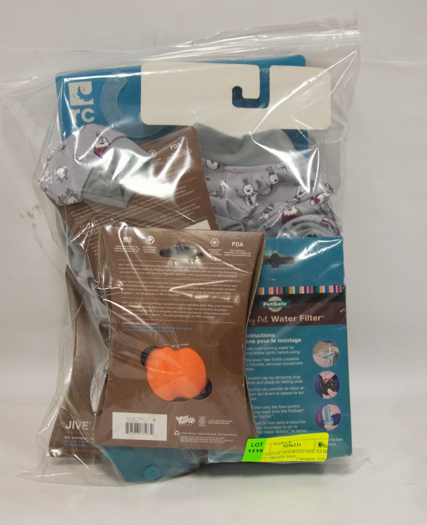 BAG LOT OF ASSORTED SIZE XS DOG TOYS, TREATS AND