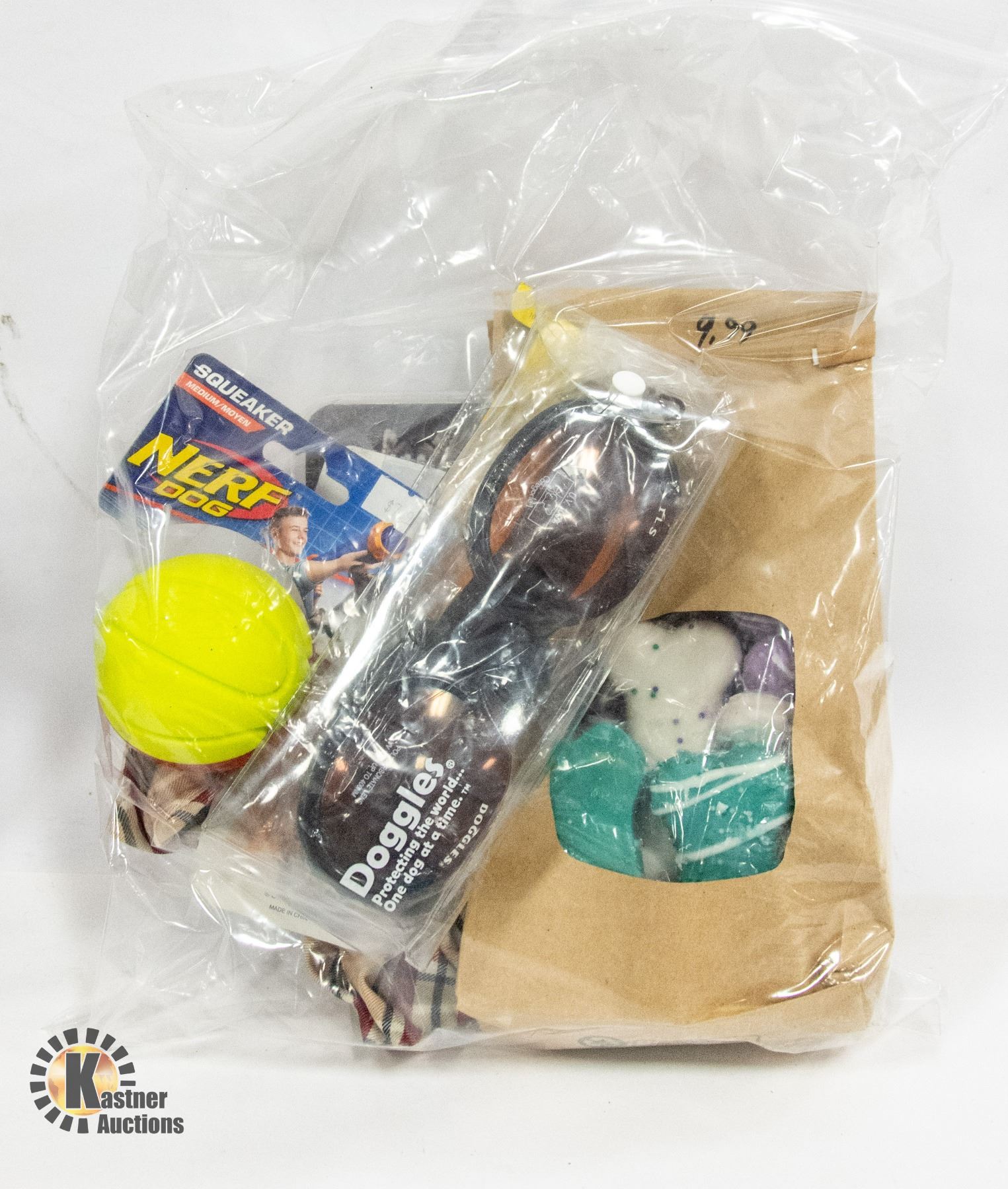 BAG LOT OF ASSORTED SIZE XXL DOG TOYS, TREATS AND