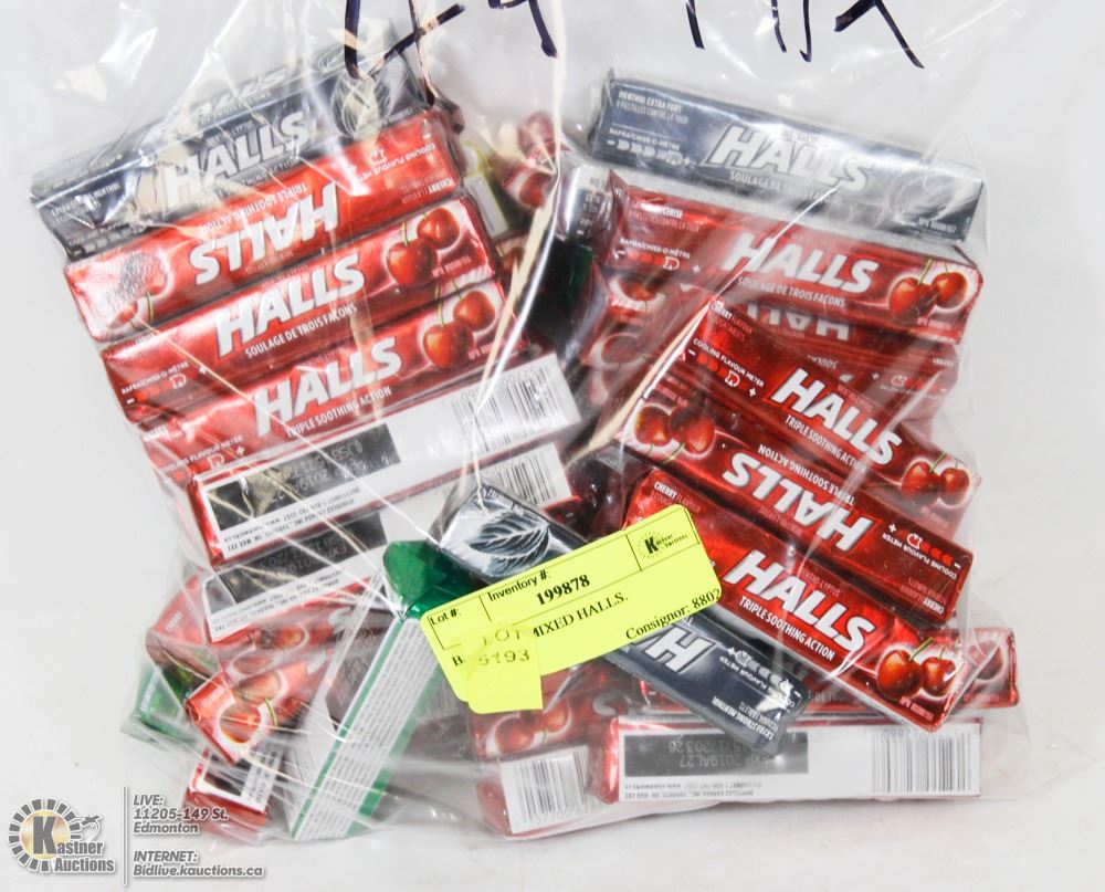 BAG OF 44 MIXED FLAVOR HALLS COUGH DROPS.