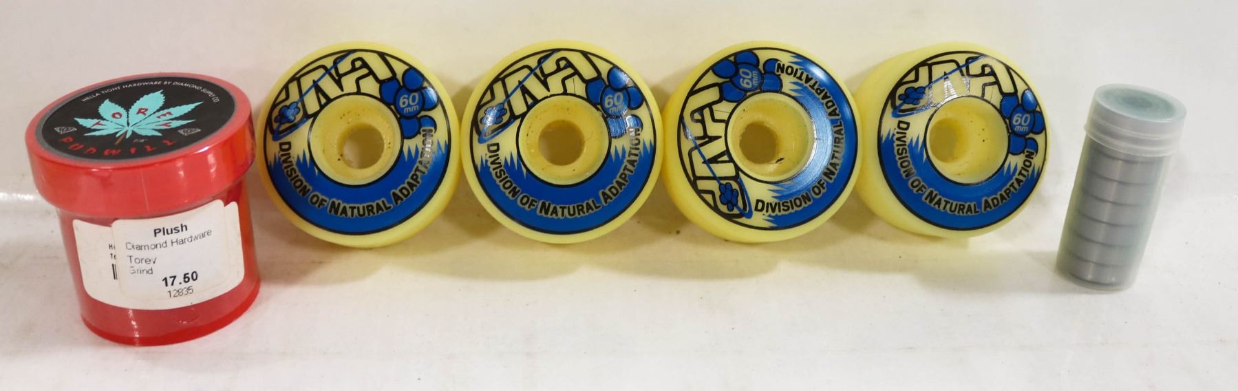 BAG OF 60MM WHEELS, BEARINGS AND HARDWARE