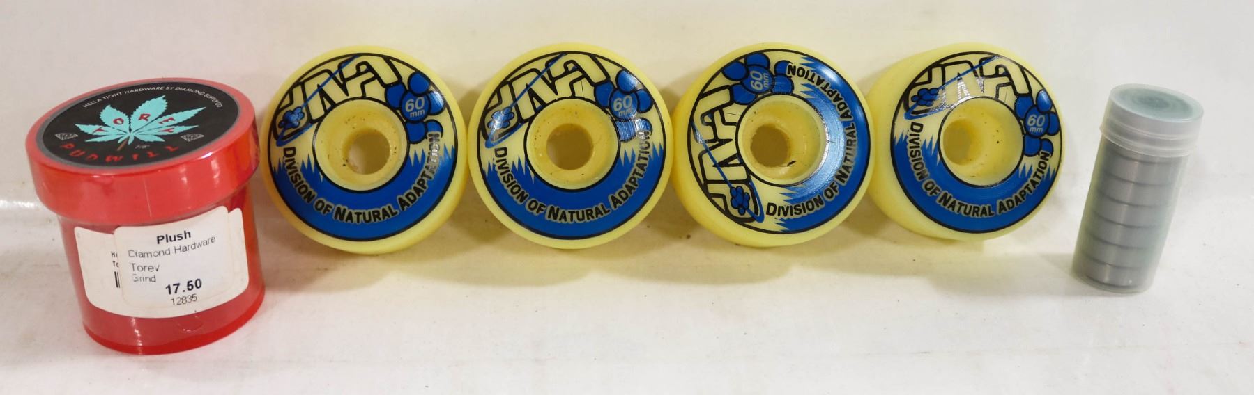 BAG OF 60MM WHEELS, BEARINGS AND HARDWARE