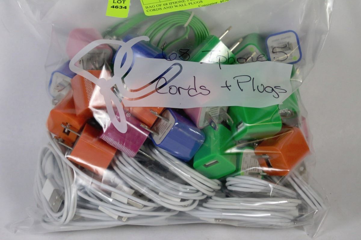 BAG OF 68 IPHONE 5 CHARGER CORDS AND WALL PLUGS