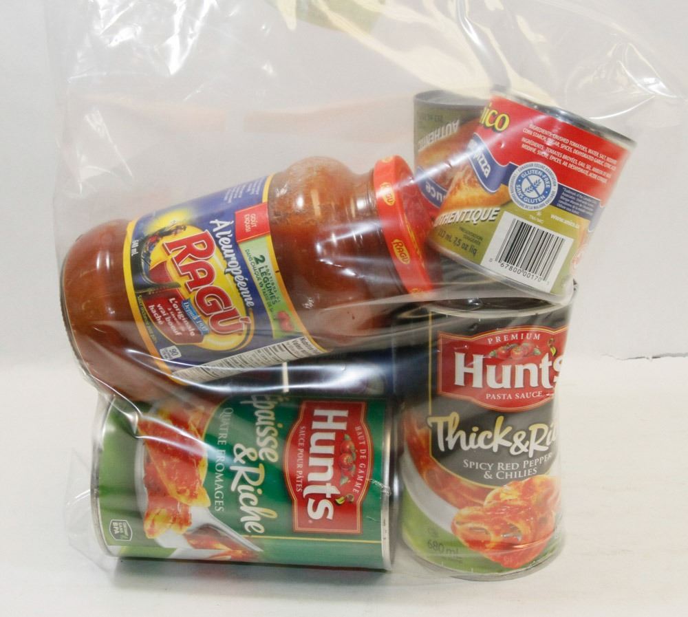 BAG OF ASSORTED INCL PASTA SAUCE, OLIVES AND MORE.
