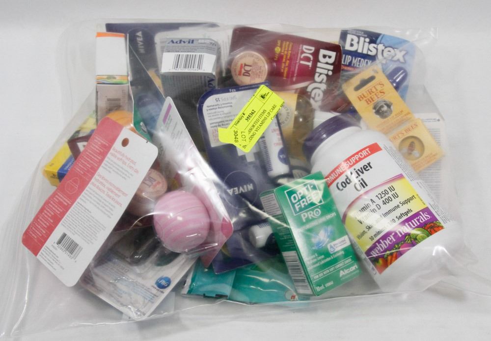 BAG OF ASSORTED ITEMS INCLUDING VITAMINS LIP CARE