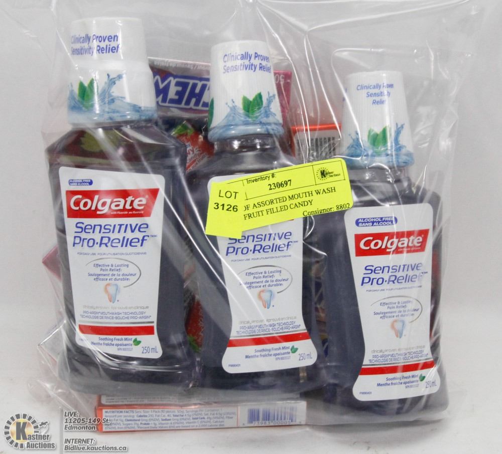 BAG OF ASSORTED MOUTH WASH AND FRUIT FILLED CANDY