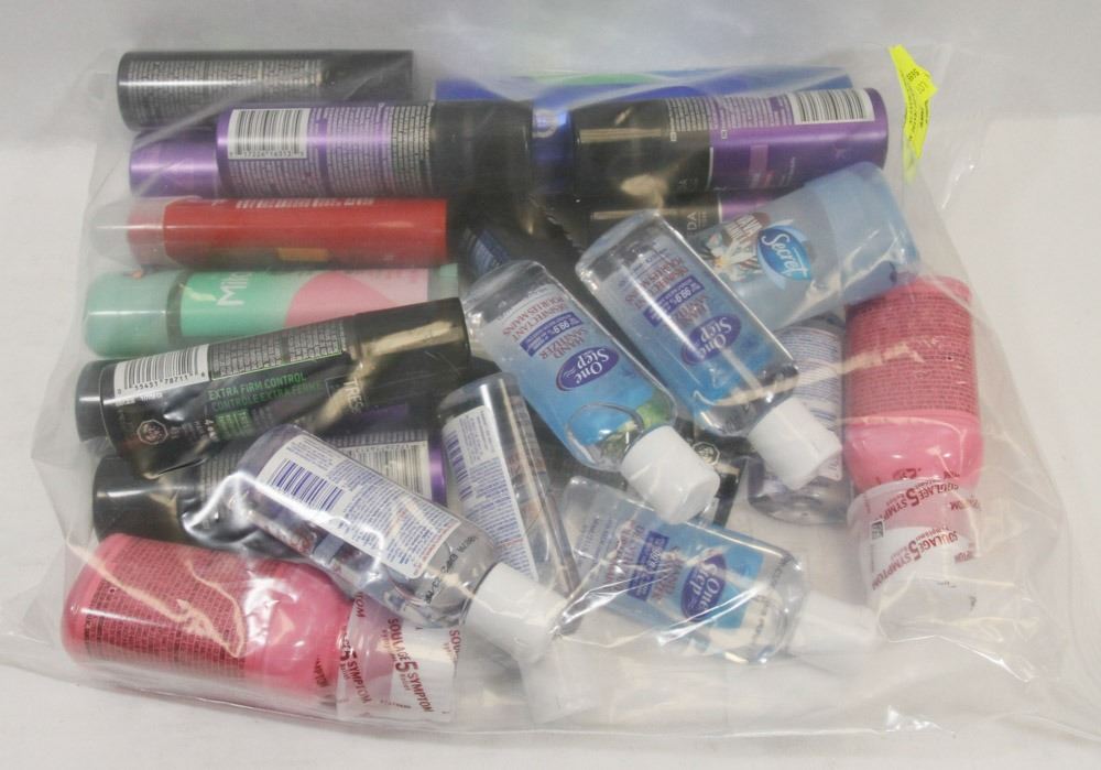 BAG OF ASSORTED TRAVEL SIZE HAIR AND SKIN PRODUCTS