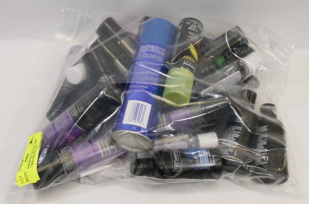 BAG OF ASSORTED TRAVEL SIZE HAIR AND SKIN PRODUCTS