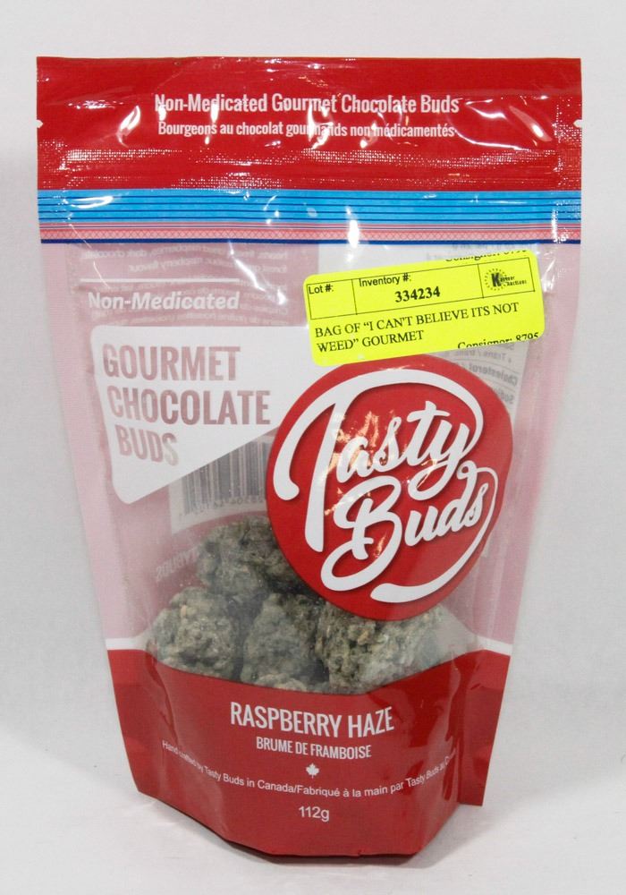 RASPBERRY HAZE CHOCOLATE BUDS. NON-MEDICATED GOURMET CHOCOLATES. 112G. MADE IN CANADA