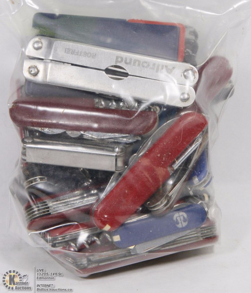 BAG OF MIXED SWISS ARMY KNIVES, MULTI TOOLS AND