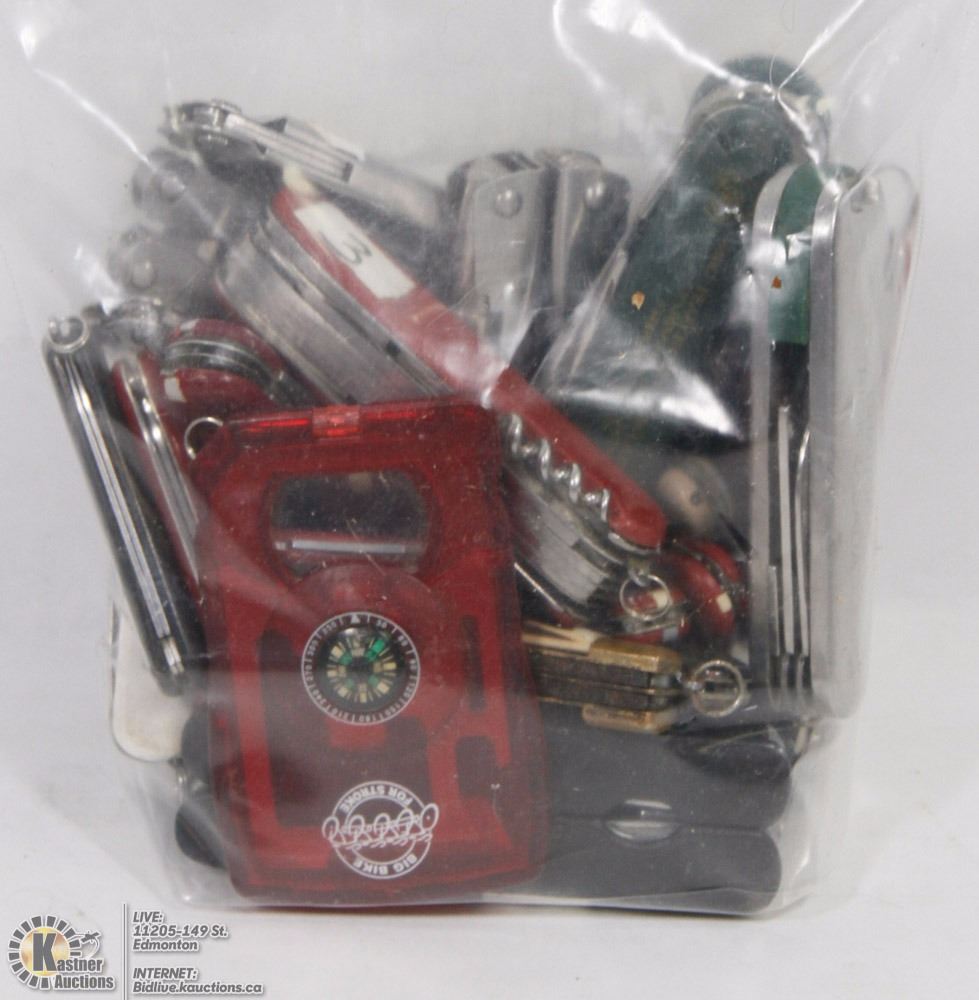 BAG OF MIXED SWISS ARMY KNIVES, MULTI TOOLS AND