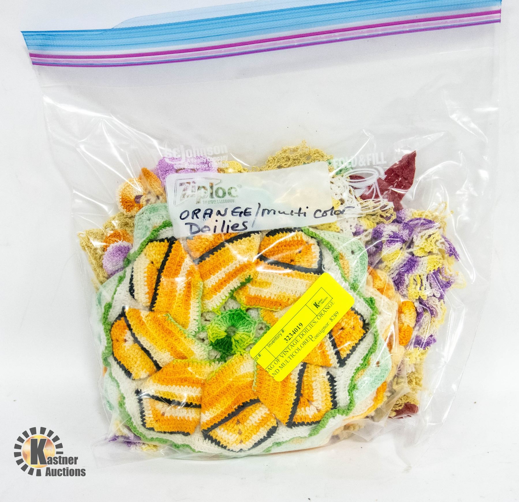 BAG OF VINTAGE DOILIES, ORANGE AND MULTICOLORED