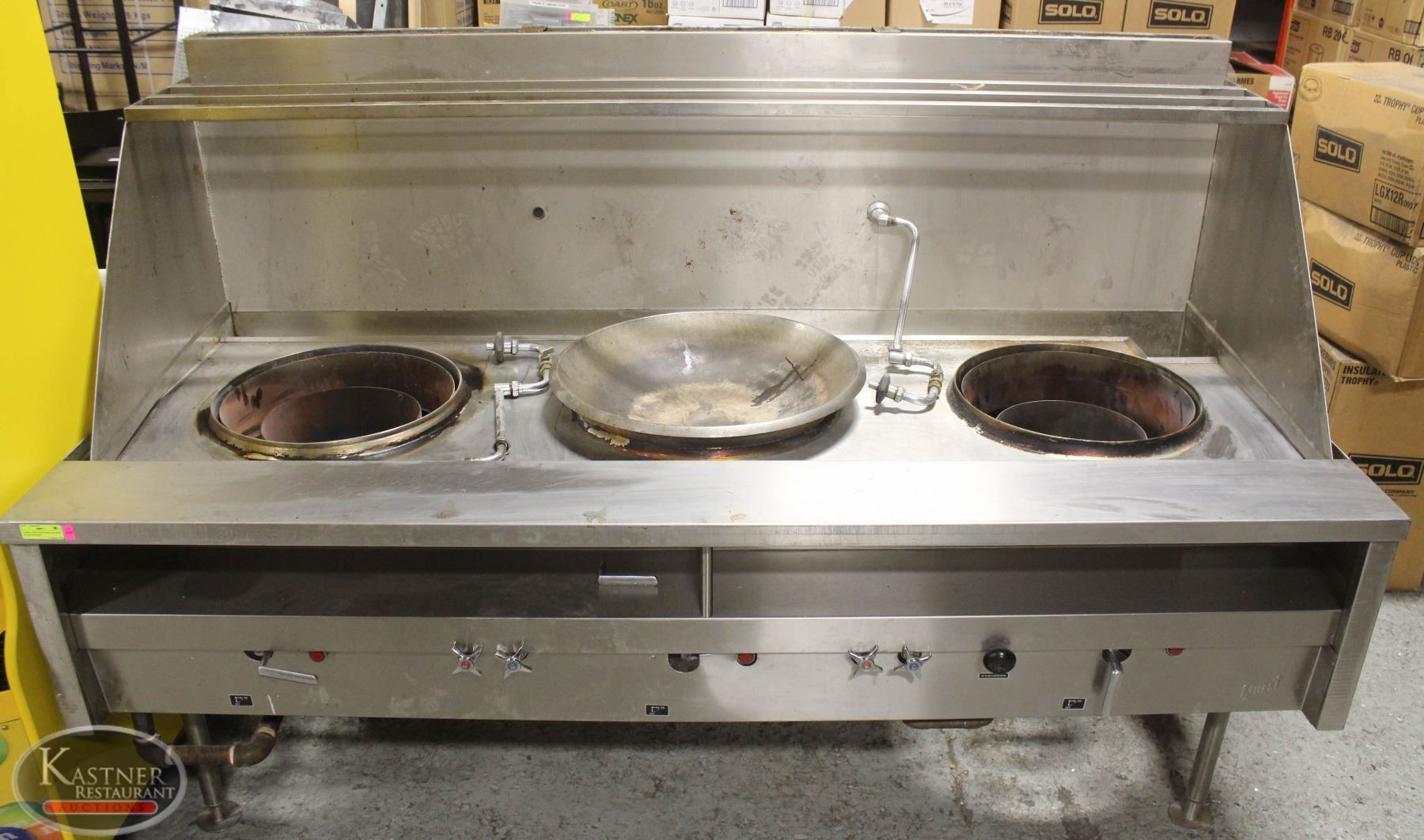 BACKSPLASH *1 WOK INCLUDED, TWO TAPS & BACKSPLASH, CENTER SHUTOFF VALVE LEVER NEEDS REPLACEMENT. 86" X 43" X 34.5"-57"(MAX) ****BID SUBJECT TO BANK, BAILIFF, OR OWNER APPROVAL.**** PICKUP AT KASTNER'S MAIN LOCATION @ 11205 149ST NW