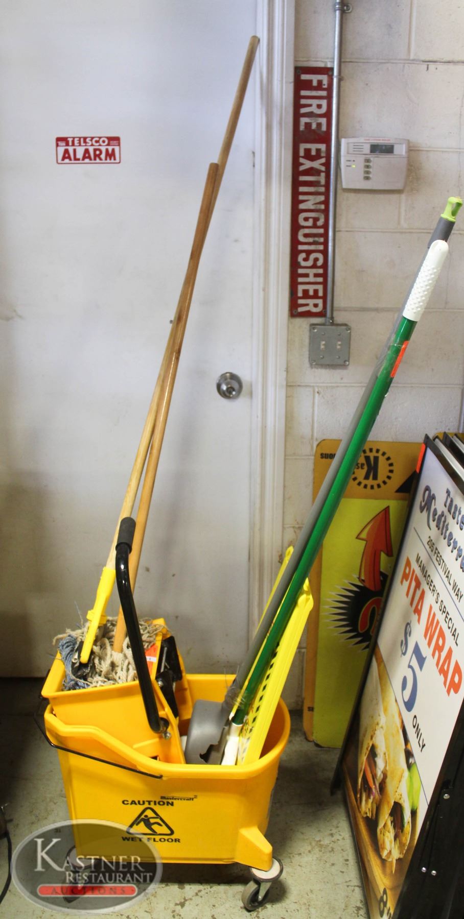 PAIL, WRINGER, MOP, 2 BROOMS & DUSTPAN, W/ "CAUTION WET-FLOOR" 2-SIDED SIGN
