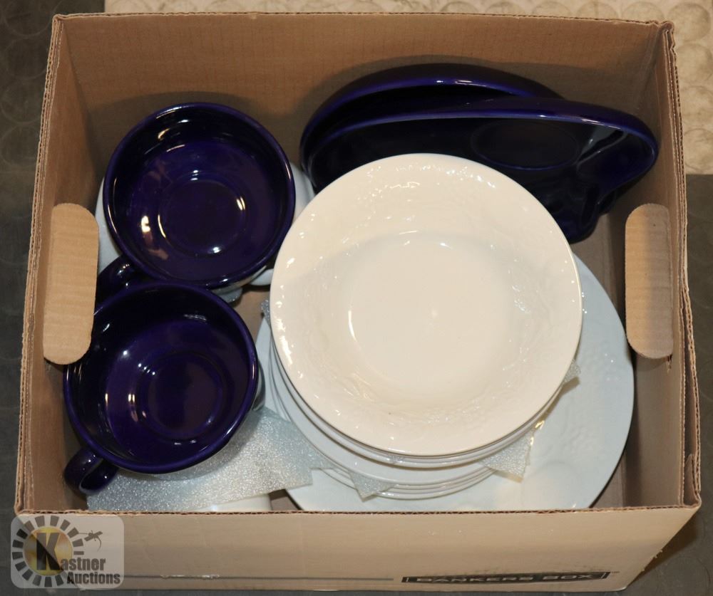 BANKERS BOX OF WHITE AND BLUE DISHES
