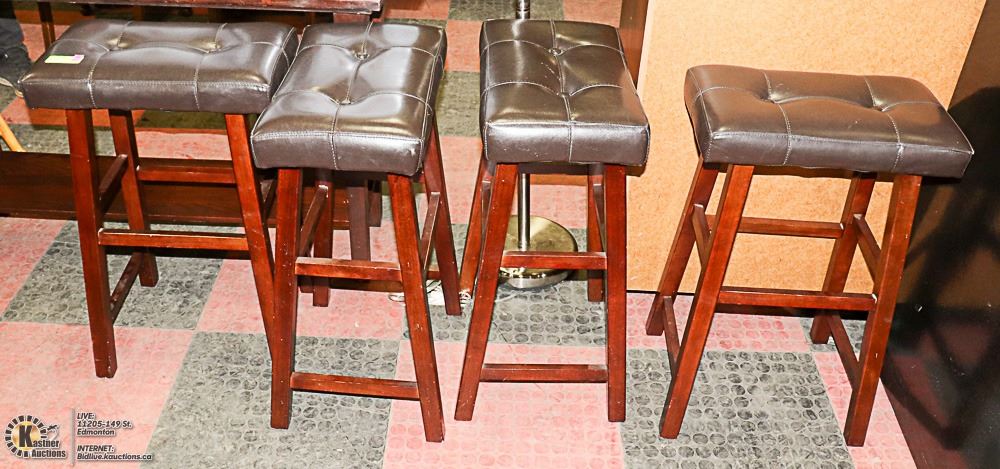 SET OF 4 MATCHING BROWN BAR STOOLS WITH LEATHERETTE SEATS. VERY GOOD CONDITION-FURNITURE