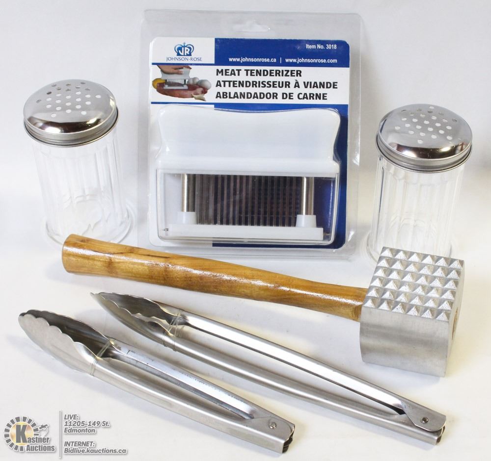 NEW - HEAVY DUTY MEAT MALLET, 9 & 12 INCH TONGS, 48 KNIFE MEAT TENDERIZER, 2 PEPPER SHAKERS