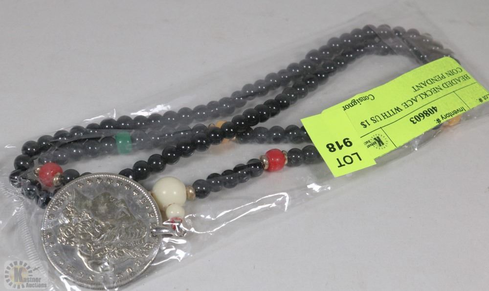 BEADED NECKLACE WITH US 1$ COIN PENDANT