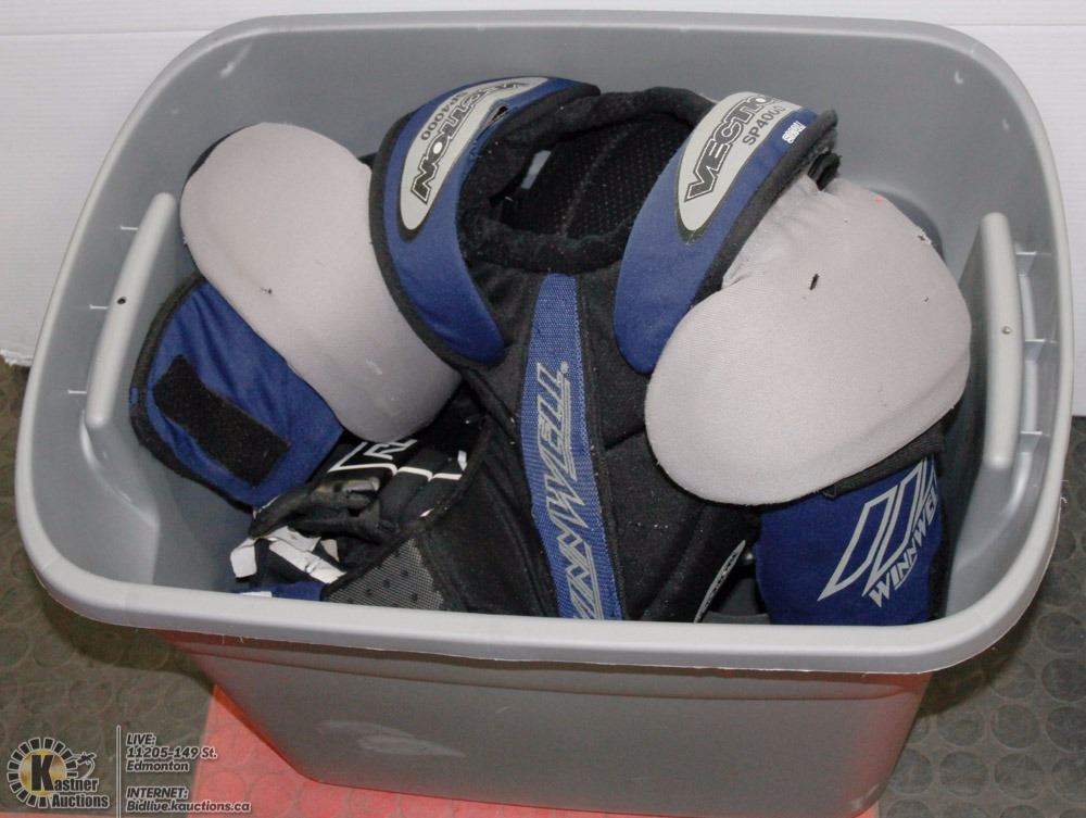 GLOVES, BODY ARMOUR, 2 HELMETS, KNEE PADS, ETC