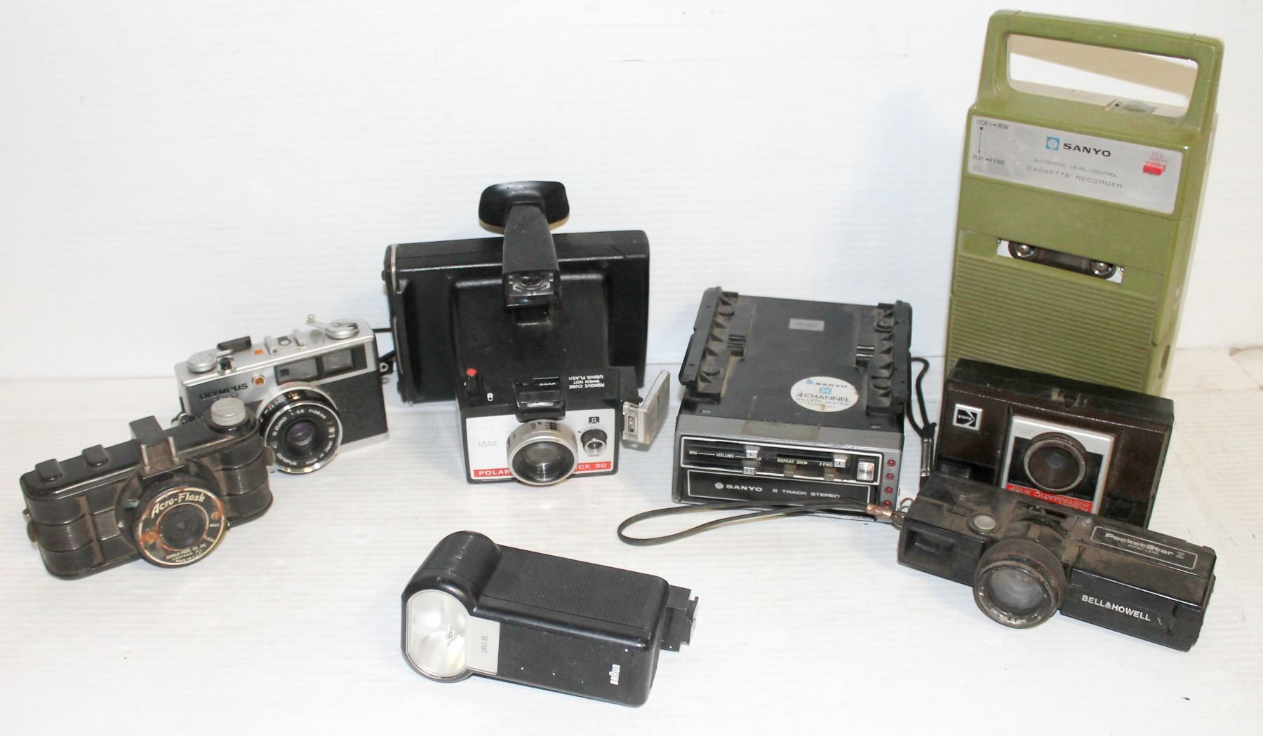BIN OF 6 VINTAGE CAMERAS + 28 TRADE PLAYERS