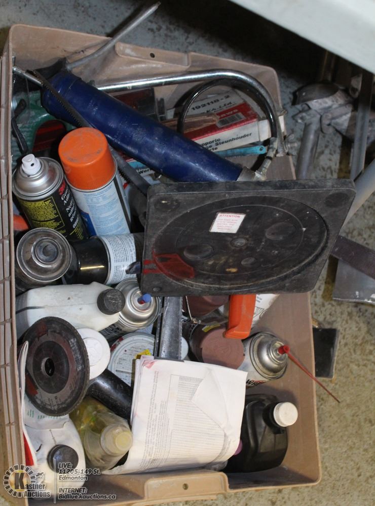 BIN OF ASSORTED ADHESIVES, LUBRICANTS AND MORE