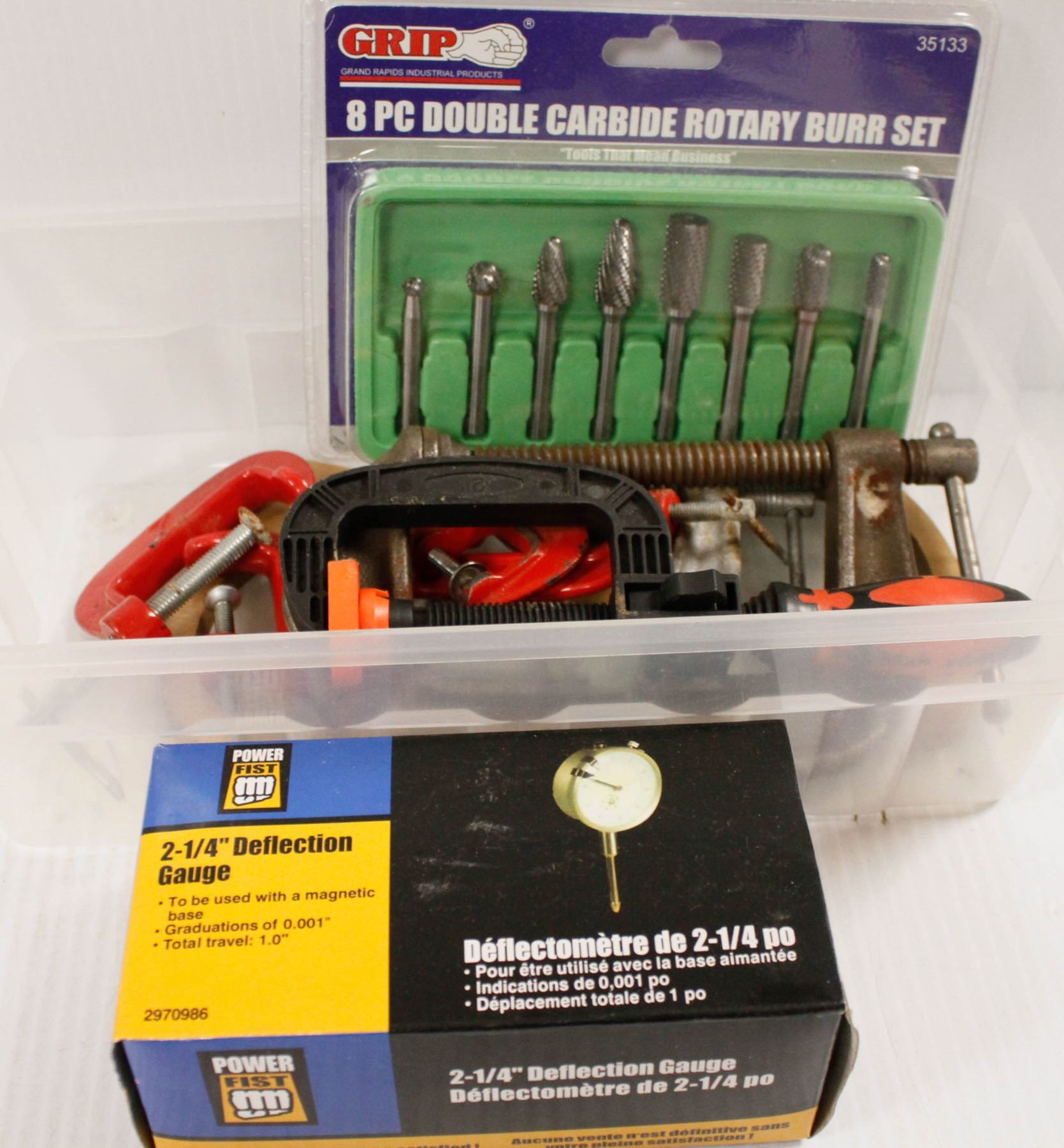 BIN OF ASSORTED NEW TOOLS, CLAMPS, BITS AND MORE
