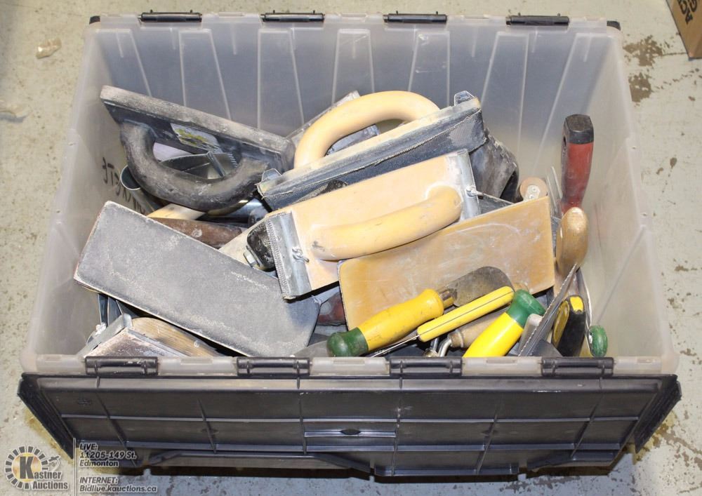 BIN OF CONCRETE & DRYWALL FINISHING TOOLS