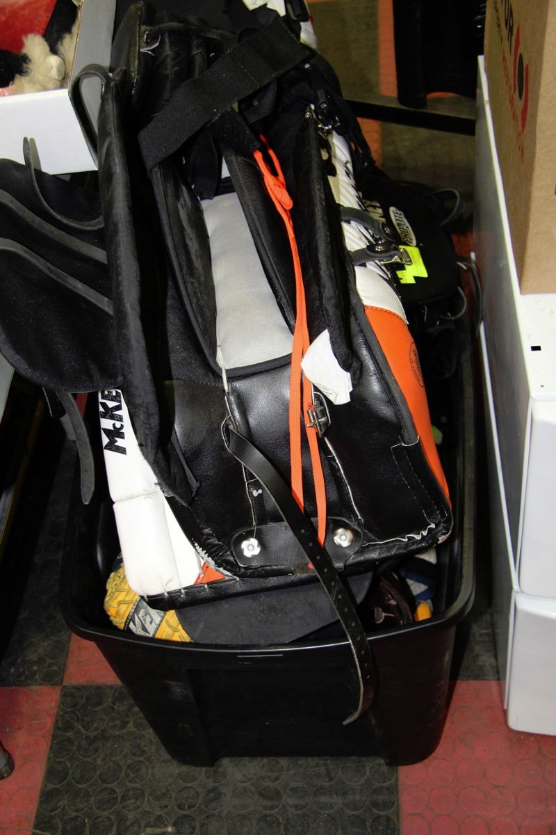 BIN OF GOALIE EQUIPMENT FOR HOCKEY